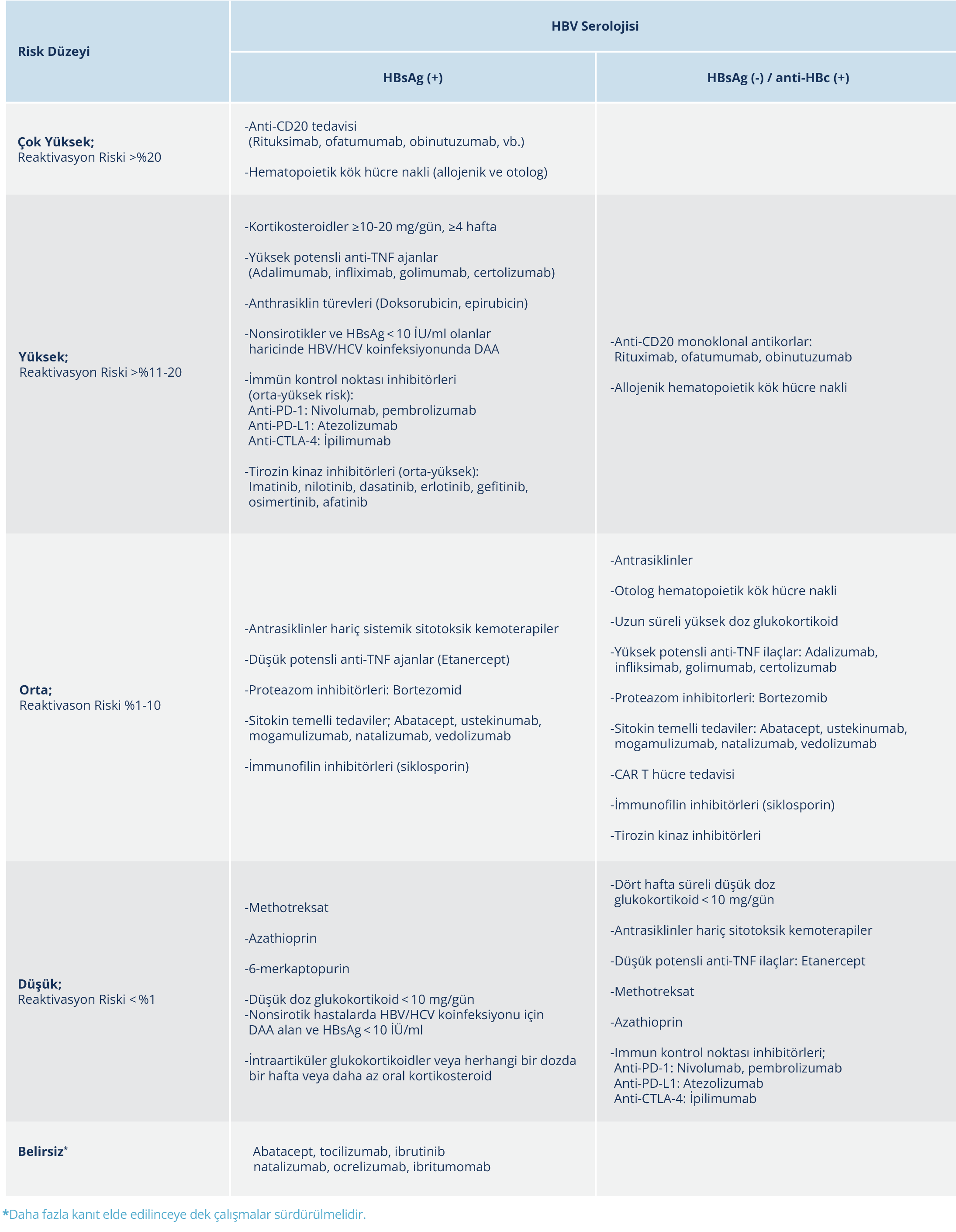 - DEA tedavisi alacak ve HBsAg test sonucu pozitif olan tüm hastalara HBV için tedavi süresince ve tedavi sonrasında 12 hafta boyunca potent nükleoz(t)id analoğu ile profilaksi verilmelidir.