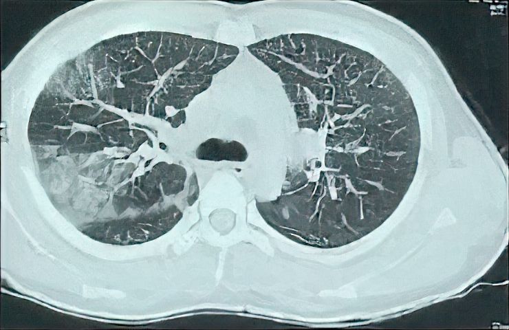 A 27-year-old male engineer was brought to the emergency department with complaints of fever, shortness of breath, and coughing up blood for 14 days. The patient was not a known diabetic or hypertensive and was not on any medication in the recent past or at the time of admission.