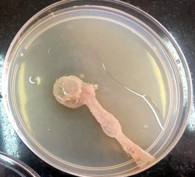 His echocardiography was within normal limits apart from pulmonary systolic pressure of 45 mmHg. Screening tests for HBsAg and HCV antibodies were negative. Based on history and HRCT findings, the patient was provisionally diagnosed as a case of mild COVID-19 infection. He was not given corticosteroid treatment during COVID-19 infection. RT-PCR for COVID-19 was negative twice at 48 hours intervals. On day 4 of admission, screening tests for autoimmune disorders (ANA, anti-ds DNA, ANCA c, ANCA p, anti-cardiolipin antibodies, anti-basement membrane antibodies, direct and indirect coombs test) were negative apart from low C3 (30 mg/dL) and urine analysis revealed proteinuria (600 mg). However, during admission, WBC increased to 65 000 per microliter, then 130 000 per microliter, with peripheral eosinophilia of 40%. An increase in WBC was associated with a drop in hemoglobin and platelets to 7.5 g/dL and 40 000 per microliter, respectively. Peripheral blood smear, bone marrow aspiration, and biopsy revealed toxic granules, and hematological malignancies were excluded. The rheumatology and immunology department diagnosed the patient as having undifferentiated connective tissue disease based on clinical and laboratory data. Corticosteroid (methylprednisolone 500 mg IV daily for four consecutive days) was started for undifferentiated connective tissue disease. The patient had diarrhea and a painful knee joint with limitation of activity during hospital admission. CT angiography of the abdomen showed patent abdominal vessels, and knee effusion was found in the knee ultrasound. Tropical disease consultation advised stool and sputum analysis to exclude parasitic infestations, especially with the presence of eosinophilia. Sputum and stool culture (single sample) revealed migratory tracts on agar plates, suggesting Strongyloides stercoralis infection (Figure 2). After extensively checking the possible immunocompromised condition of the patient, human HTLV-1 infection, HIV antibody, and immunoglobulin levels were negative. Albendazole (400 mg/day in divided doses for three days) was started, followed by improvement of clinical parameters of the patient (respiratory rate 20/minute, SpO2 98% without oxygen) and laboratory parameters (WBCs 10 000 per microliter, eosinophil 5%, CRP negative, ESR 5 mm/hr.). Despite these improvements in clinical and laboratory data, HRCT did not improve, and the patient developed neurological symptoms with an MRI diagnosis of autoimmune encephalitis.