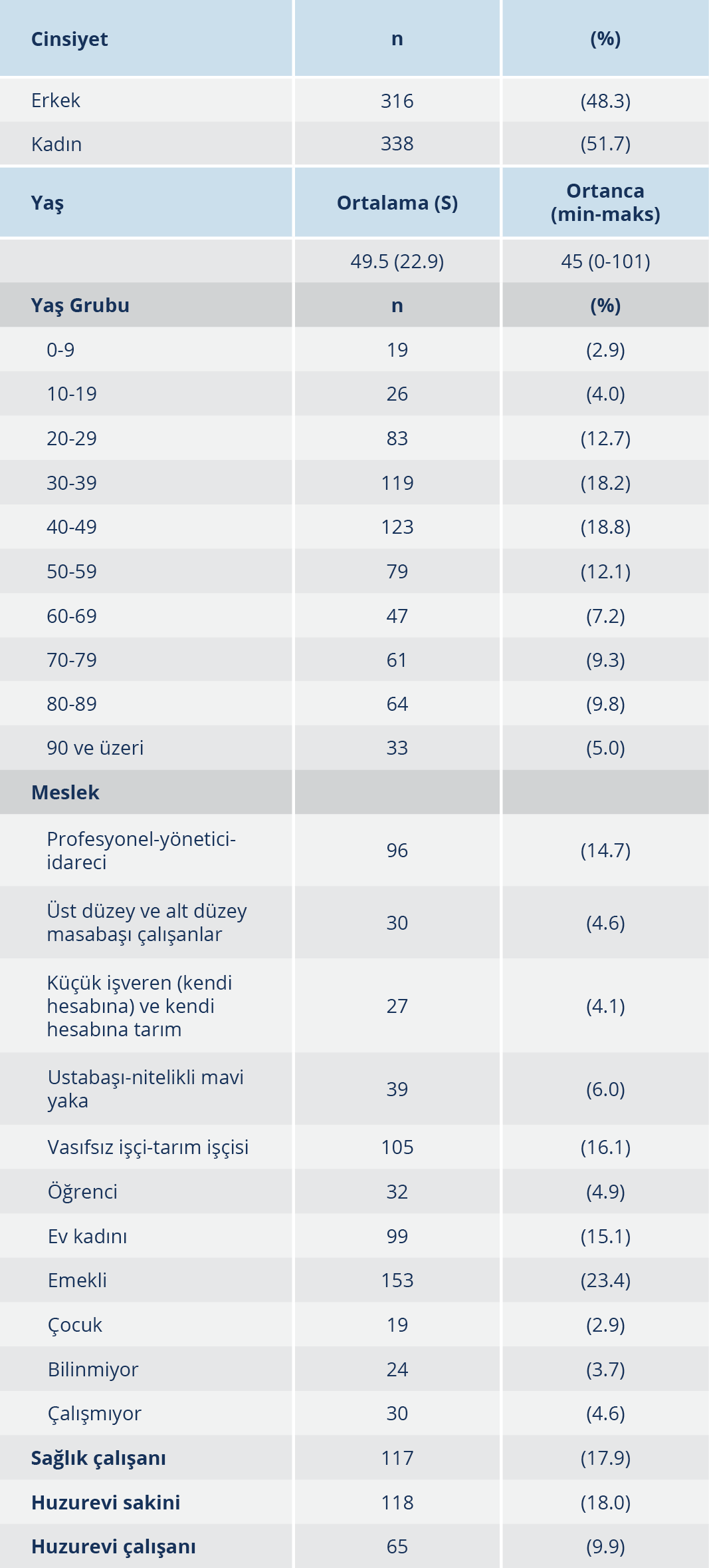 Olguların %51.7’sini kadınlar oluşturmuştur. Yaş ortalaması 49.5 (±22.9); ortanca 45’tir. Olguların yaşları 0 (16 gün) ile 101 arasında değişmektedir. En fazla 40-49 (%18.8) yaş grubunda olgu bulunmaktadır. Olguların %17.9’u sağlık çalışanıdır. Huzurevi sakinleri olguların %18’ini; huzurevi çalışanları %9.9’unu oluşturmaktadır (Tablo 1).