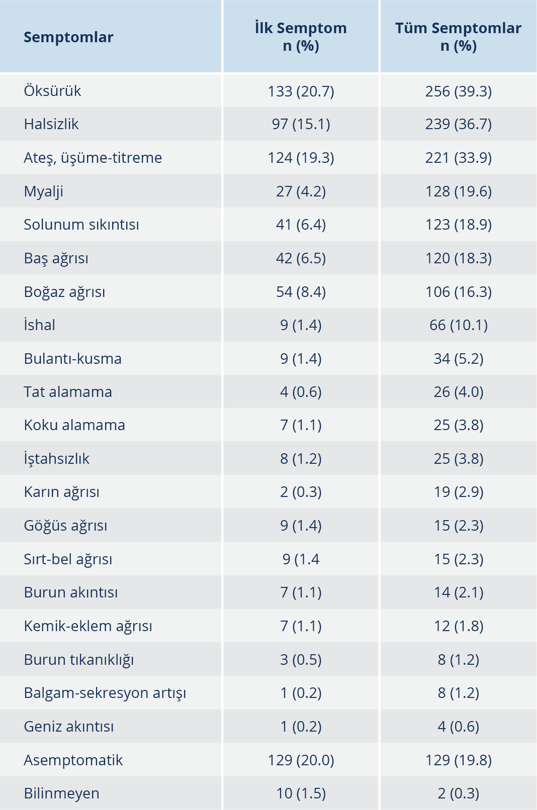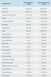 Tablo 2’de olgularda başvuruda görülen ilk semptomların ve genel olarak semptomların sıklıkları görülmektedir. Öksürük başvuruda en sık görülen ilk semptom olmuştur. Bunu ateş, üşüme-titreme ve halsizlik izlemektedir (sırasıyla %20.7, %19.3 %15.1). Başvurudaki tüm semptomlar incelendiğinde ise en sık öksürük, ikinci sıklıkla halsizlik ve üçüncü olarak ateş, üşüme-titreme görülmüştür (sırasıyla %39.3, %36.7, %33.9). Olguların %19.8’i ise başvuruda asemptomatiktir (Tablo 2).