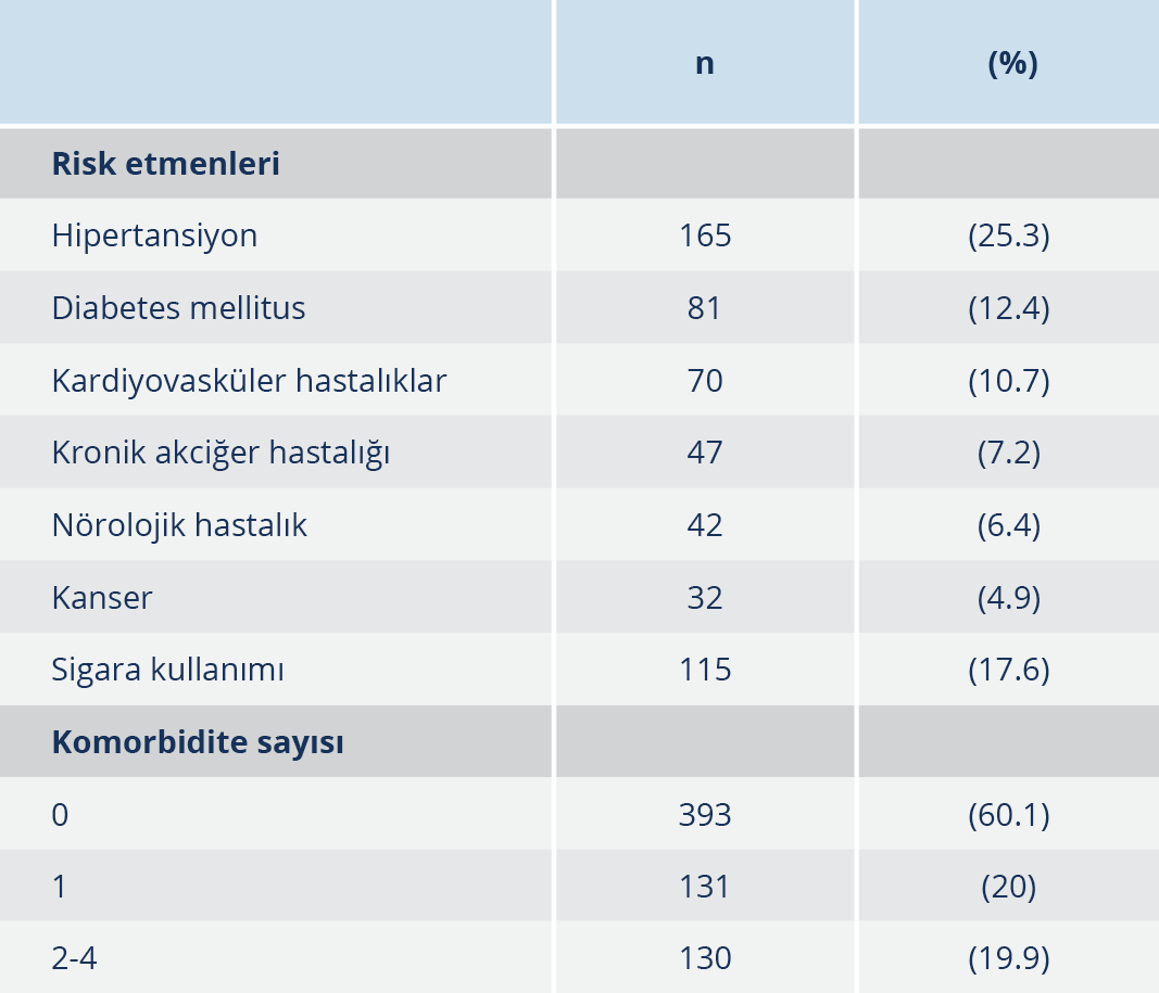 Olguların %39.9’unun en az bir komorbiditesi bulunmaktadır. İki ve daha fazla komorbiditesi olanların sıklığı ise %19.9’dur. En sık olarak sırasıyla hipertansiyon, diabetes mellitus ve kardiyovasküler hastalıklar eşlik etmektedir (%25.3, %12.4, %10.7) (Tablo 3).