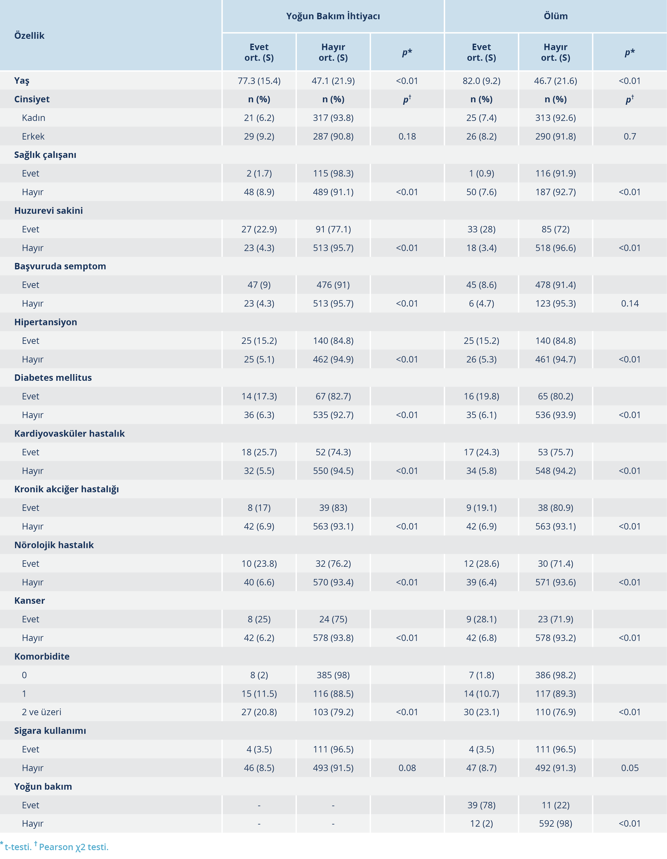 YBÜ yatışı ve ölüm görülen ve görülmeyen olguların karşılaştırılması Tablo 4’te görülmektedir. Buna göre yoğun bakım ihtiyacı olan olguların yaş ortalaması 77.3 (±15.4); olmayanların yaş ortalaması 47.1 (±21.9)’dir. Ölen olguların yaş ortalaması 82.0 (±9.2); hayatta kalan olguların yaş ortalaması 46.7 (±21.6)’dir (p<0.05). YBÜ yatışı olanlar içinde sağlık çalışanı olmayanlar, huzurevi sakini olanlar, başvuruda semptomu olanlar, komorbiditesi olanlar ve komorbidite sayısı fazla olanlar istatistiksel olarak anlamlı düzeyde fazladır (p<0.05). Ölenler içinde ise sağlık çalışanı olmayanlar, huzurevi sakini olanlar, komorbiditesi olanlar, komorbidite sayısı fazla olanlar ve YBÜ yatışı olanlar istatistiksel olarak anlamlı düzeyde fazladır (p<0.05) (Tablo 4).