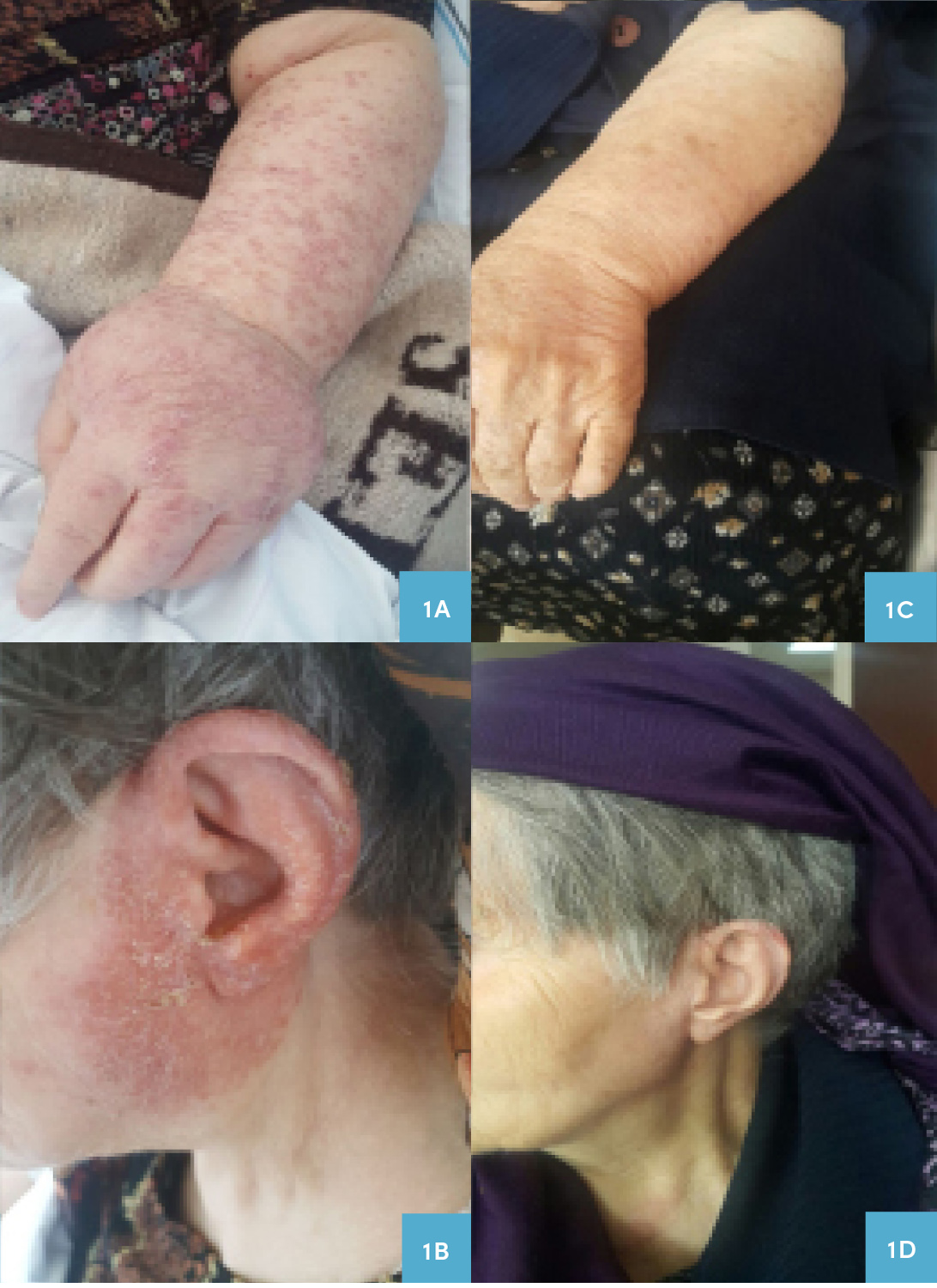Yetmiş dokuz yaşında kadın hasta polikliniğimize sol kolda şişlik, döküntü ve sol kulak kepçesinde yara şikayetiyle başvurdu. Öyküsünden bu şikayetle yaklaşık 1.5 yıldır bir çok sağlık kuruluşuna başvurduğu ve değişik tedaviler aldığı ancak şikayetlerinin gerilemediği öğrenildi. Yirmi dört yıl önce akciğer tüberkülozu geçiren hastanın fizik muayenesinde sol kolunda şişlik, hiperpigmente alanlar ve makülopapüler döküntüsü olduğu, ayrıca sol kulak kepçesinde de benzer lezyonlar bulunduğu tespit edildi (Resim 1A ve 1B). Diğer sistem muayeneleri normal olarak değerlendirildi. Tetkiklerinde lökosit sayısı 5400 hücre/mm3 (4000-10 000 hücre/mm3), hemoglobin 12.4 gr/dl (12-16 gr/dl), platelet sayısı 285 000 hücre/mm3 (150 000-450 000 hücre/mm3), eritrosit sedimantasyon hızı (ESR) 76 mm/1.saat, C-reaktif protein (CRP) 2.8 mg/dl (0-0.8 mg/dl) olarak saptandı. PPD 20 mm ve interferon γ-salınım (IGS) testi pozitif olan hasta Dermatoloji Kliniği’yle konsülte edildi. Dermatoloji Kliniği tarafından hastanın lezyonlarının “tuberculosis verrucosa cutis” veya lupus vulgaris olabileceği düşünüldü. Hastanın kolundaki ve kulağındaki lezyonlardan biyopsi alındı. Alınan örneklerde asidorezistan basil (ARB) görülmedi ve tüberküloz PCR negatif olarak tespit edildi. Ancak hastanın patoloji sonucunun granülomatöz infeksiyonla uyumlu saptanması, geçmişinde tüberküloz geçirme öyküsünün bulunması, lezyonlarının görünümünün tüberkülozla uyumlu olması ayrıca PPD ve IGS testlerinin de pozitif saptanması üzerine hastaya dörtlü antitüberküloz (izoniyazid [INH] 300 mg, rifampisin [RIF] 600 mg, etambutol [ETM] 1500 mg, pirazinamid [PZA] 2000 mg) tedavi başlandı. Tedavi başlandıktan sonra sonuçlanan tüberküloz kültüründe M. tuberculosis complex üredi ve ilaç direnci saptanmadı. Tedaviyle hastanın lezyonları gerilemeye başladı. Tedavinin dördüncü ayından sonra lezyonları tamamen düzeldi. Hastanın tedavisi 6 aya tamamlanarak kesildi (Resim 1C ve 1D).