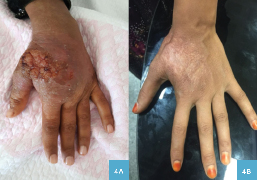 Yirmi bir yaşında kadın hasta sol el üstünde yara şikayetiyle polikliniğimize başvurdu. Öyküsünden bu yaranın altı aydır olduğu, başvurduğu sağlık kuruluşlarında tanı konulamadığı ve verilen tedavilerle iyileşmediği öğrenildi. Fizik muayenede sol el dorsal yüzde hiperkerotik 3×5 cm boyutlarında açık yarası mevcuttu, diğer sistem muayeneleri normal olarak değerlendirildi (Resim 4A). Tetkiklerinde lökosit sayısı 6300 hücre/mm3 (4000-10 000 hücre/mm3), hemoglobin 13.3 gr/dl (12-16 gr/dl), platelet sayısı 331 000 hücre/mm3 (150 000-450 000 hücre/mm3), ESR 16 mm/1.saat, CRP 0.2 mg/dl (0-0.8 mg/dl) tespit edildi. PPD’si 20 mm saptanan hasta Dermatoloji Kliniğiyle konsülte edilerek lezyondan biyopsi alındı. Alınan örnekte ARB görülmedi, tüberküloz PCR negatif olarak saptandı ve mikobakteri kültüründe üreme olmadı. Histopatolojik incelemede lupus vulgaris tanısı konulan hastaya dörtlü antitüberküloz (INH 300 mg, RIF 600 mg, ETM 1500 mg, PZA 2000 mg) tedavisi başlandı. Tedavinin dördüncü ayında lezyonları düzelen hastanın tedavisi altı aya tamamlanarak kesildi (Resim 4B).