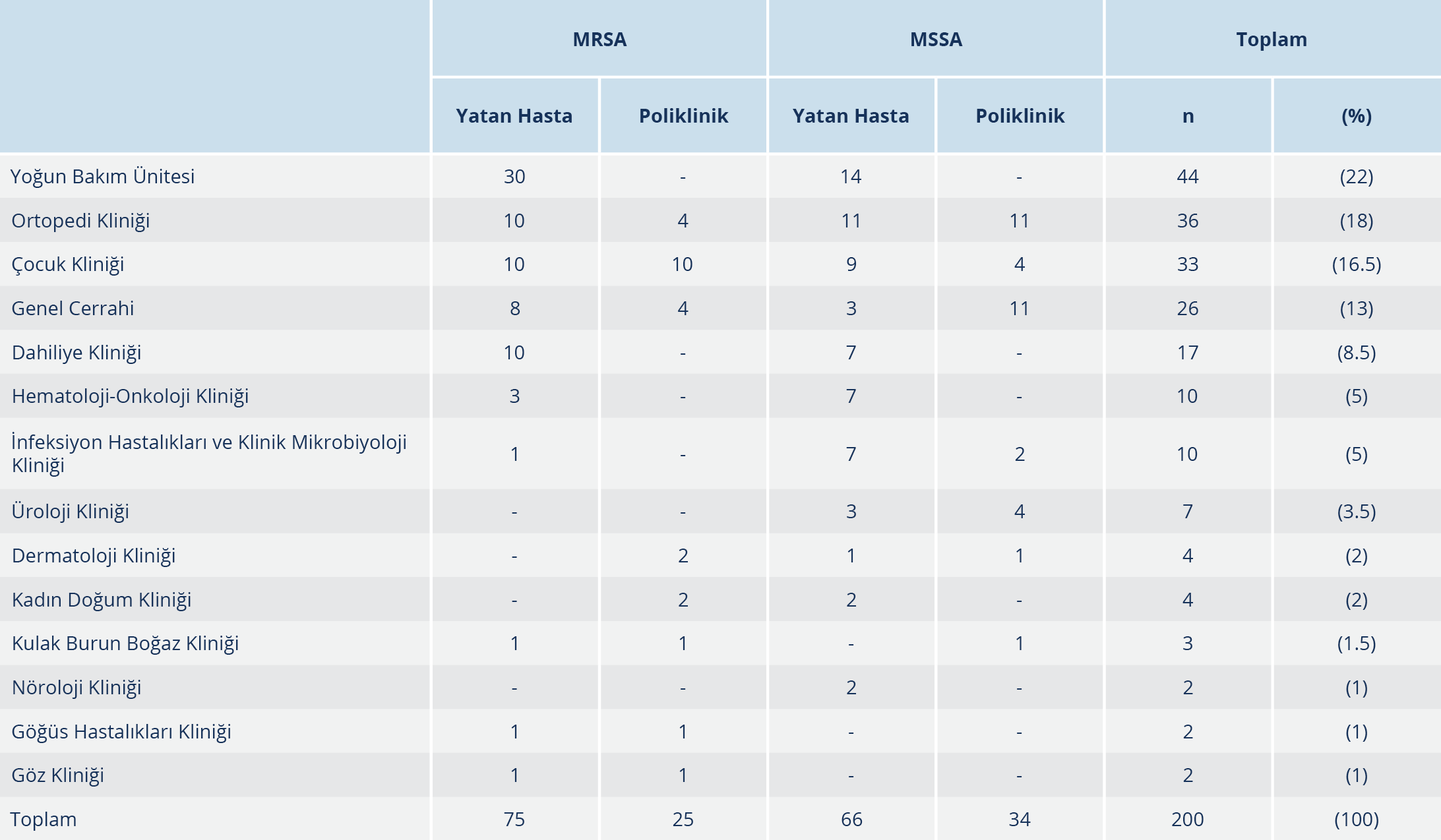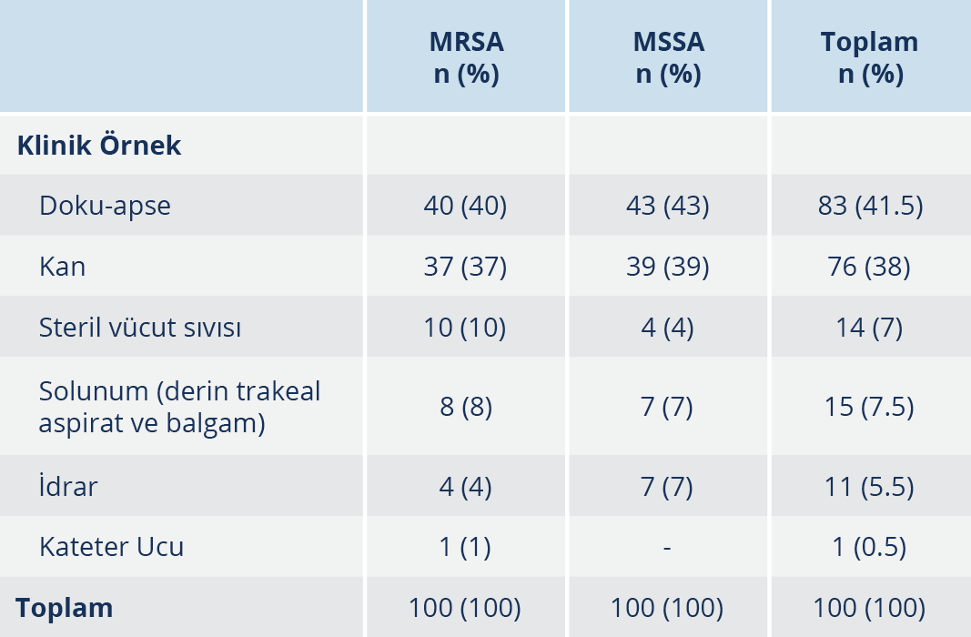Çalışmaya alınan MRSA suşlarının %75’i ve MSSA suşlarının %66’sı yatan hastalara ait örneklerden izole edilmiştir. MRSA izolatlarının %43’ü kadın, %57’si erkek; MSSA izolatlarının %46’si kadın, %54’ü erkek hastalardan soyutlanmıştır. Klinik örneklerinden MRSA ve MSSA izole edilen kadın hastaların yaş ortalaması sırasıyla 42.78 ile 48.08; erkek hastaların yaş ortalaması 41.50 ile 45.13 olarak saptanmıştır. Çocuk kliniği (%16.5) dışında gelen örnekler erişkin hastalara aittir (Tablo 1). İzolatlar sıklıkla yatan hastalardan izole edilmiş olup MRSA suşlarının %40’ı, MSSA suşlarının ise %21’i yoğun bakım kökenlidir. MRSA ve MSSA suşlarının izole edildikleri bölümlere göre dağılımı Tablo 1’de gösterilmiştir. Kökenlerin izole edildiği örneklerin sıklıkla doku-apse (%41.5) ve kan (%38) örneği olduğu saptanmıştır. MRSA ve MSSA suşlarının izole edildikleri örneklere göre dağılımı Tablo 2’de verilmiştir.