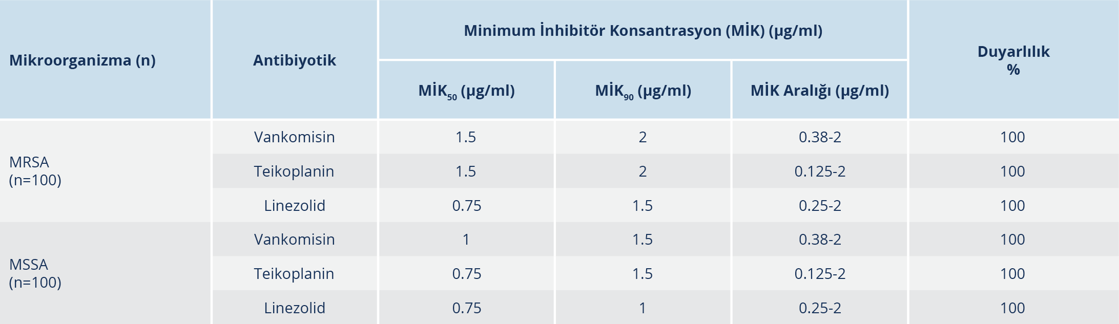 Sonuç olarak, çalışmamızda vankomisin, teikoplanin, linezolide karşı MRSA ve MSSA izolatlarında direnç saptanmamıştır. Ancak, MSSA izolatlarının glikopeptidlere karşı belirlenen MİK değerlerinin, MRSA izolatlarının MİK değerlerine yakın değerlerde saptanması gelecekte direnç gelişimi olasılığının artacağını düşündürmüş, MİK değerlerinin düzenli olarak takip edilmesinin gerekliliğini göstermiştir. Linezolid MİK90 değerlerine göre glikopeptid ajanlardan daha etkin bulunmuştur. Ancak linezolide karşı MİK yükselmesine dikkat edilmesi gerekmektedir. Ayrıca diğer antibiyotikler MSSA suşlarında oldukça etkin iken MRSA suşlarında daha dikkatli kullanılması gerektiği düşünülmektedir. Otomatize sistemlerle glikopeptid veya linezolide dirençli saptanan S. aureus izolatları mutlaka referans bir yöntemle doğrulanmalıdır. Gerekli infeksiyon kontrol önlemleriyle birlikte hastane direnç profillerinin düzenli olarak takip edilmesi, tedavi seçeneklerinin güncellenmesi ve hastanelerin kısıtlı antibiyotik kullanım politikalarının daha sıkı uygulanması vurgulanmaktadır.