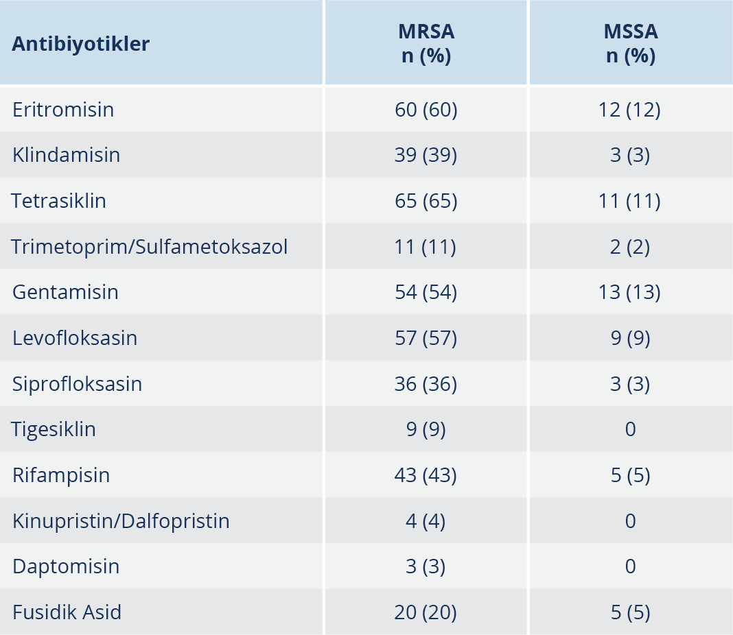- Özel Y, Büyükzengin KB, Yavuz MT. Klinik örneklerden izole edilen metisiline dirençli ve duyarlı Staphylococcus aureus suşlarının antibiyotik direnç profilinin araştırılması. Ankem Derg. 2017; 31(2): 41-7.