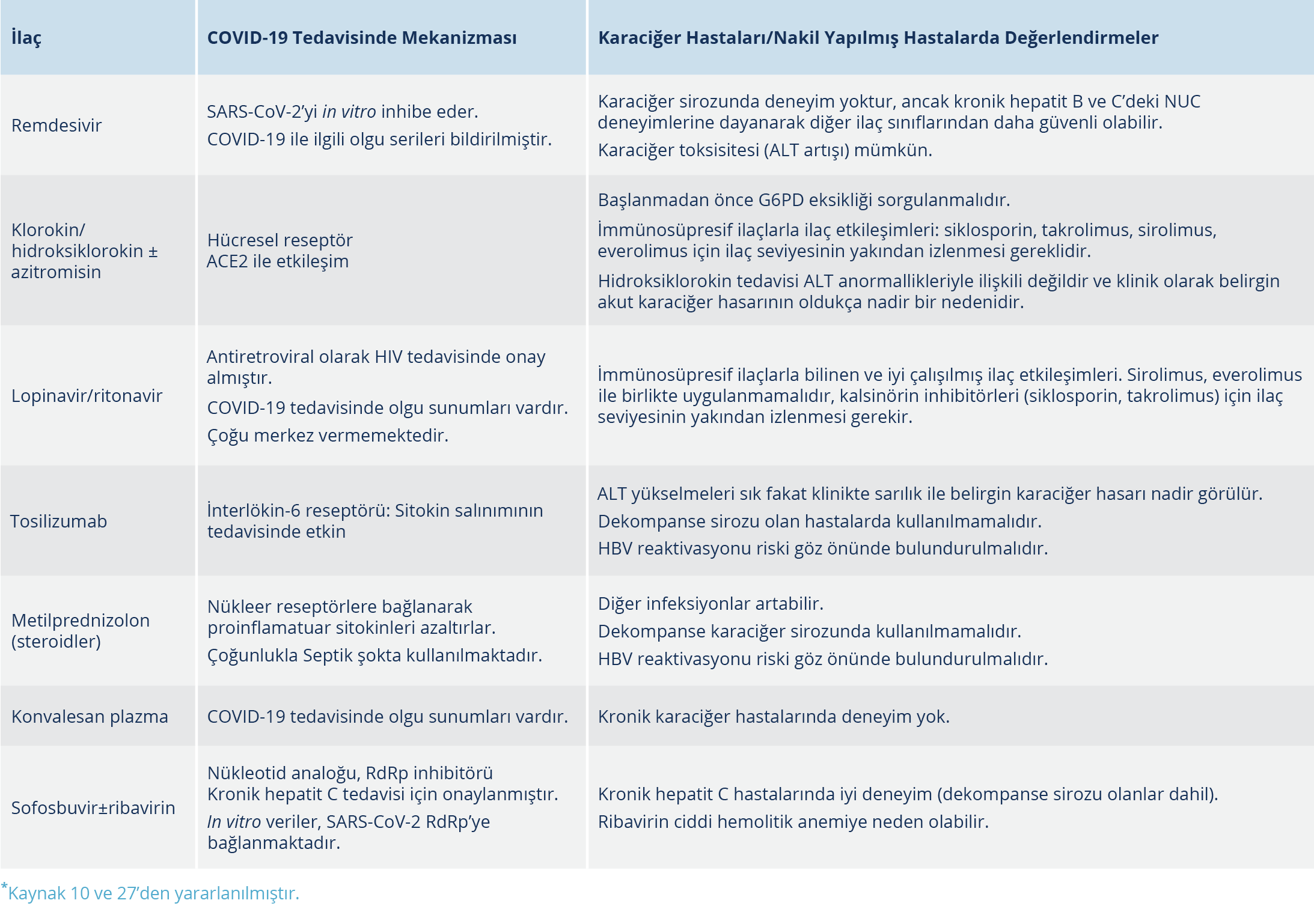 - İlaçlar (antibiyotikler, antiviraller veya destek amaçlı kullanılan diğer ilaçlar) (Tablo 1’de COVID-19 tedavisi için önerilen/tartışılan ilaçlar ve karaciğer hastalığı olan veya karaciğer nakli yapılmış hastalar için değerlendirmeler yer almaktadır.)