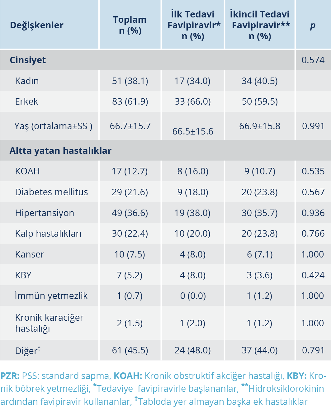 Primer tedavi olarak favipiravir alan tüm hastalar ilk gün 200 mg tb 2×8 po yükleme, takip eden 4 gün ise 2×3 tb/gün şeklinde toplam 5 gün kullanmıştı. Hidroksiklorokinden sonra favipiravir başlanan grup ise primer tedavi olarak hidroksiklorokin ilk gün 200 mg tb 2×2 po yükleme, ardından 4 gün 200 mg 2×1/gün idame olarak toplam 5 gün, ikincil olarak favipiravir 200 mg tb 2×8 po yükleme, takip eden 4 gün 2×3 tb/gün idame olarak toplam 5 gün kullanmıştı. Her iki tedavi seçeneğini de 5 günden uzun alan hasta yoktu. Hidroksiklorokin kullanan hastaların bir kısmı tek başına hidroksiklorokin bir kısmı ise hidroksiklorokinle eş zamanlı olarak 5 gün azitromisin kullanmıştı. Ancak COVID-19’a yönelik lopinavir/ritonavir, remdesivir, tocilizumab gibi başka bir ajan kullanan hasta yoktu. Favipiravir ve hidroksiklorokini eş zamanlı kullanan hasta yoktu. Araştırmaya %37.3’ü (n=50) başlangıçta favipiravir kullanan, %62.7’si (n=84) hidroksiklorokinin akabinde favipiravir başlanan toplam 134 hasta dahil edildi. Hastaların yaş ortalaması 66.8±15.7 yıldı. Başlangıçta ve sonradan favipiravir başlanan hastalar arasında yaş, cinsiyet ve ek hastalıklar açısından istatistiksel olarak anlamlı farklılık saptanmadı (p>0.05) (Tablo 1).