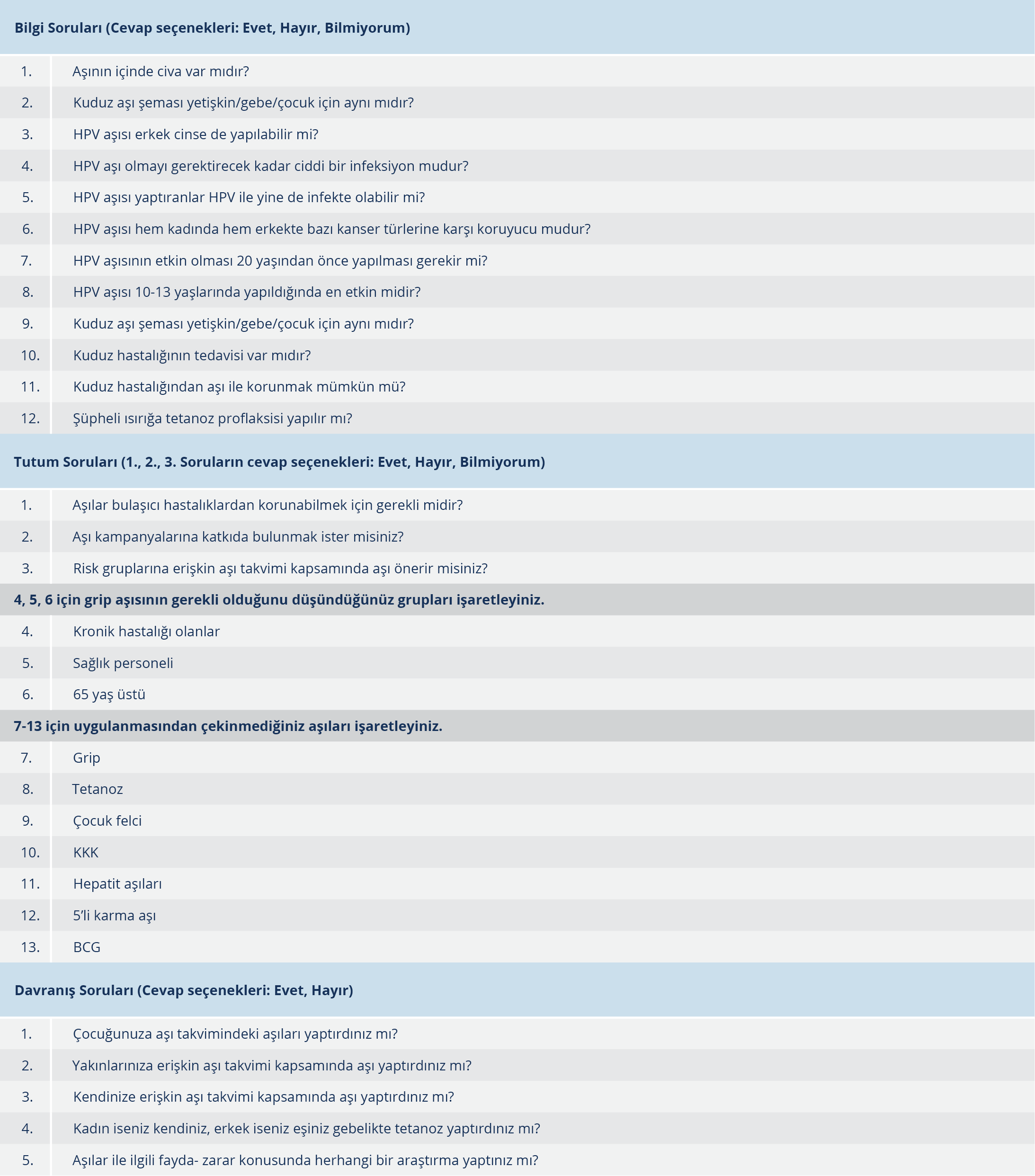 Bağımlı değişkenler, doğru cevap sayısı, tutum ve davranış puanı olup; bağımsız değişkenler, yaş, cinsiyet, medeni durum, kronik hastalık varlığı, çocuk sahibi olma durumu, çocuk sayısı, aşı fayda-zarar konusunda araştırma yapma durumudur. Gönüllülük esasına dayanılarak yapılan bu çalışma için, 19 Nisan 2018 / 8-20 tarih ve sayılı Etik Kurul onayı ve gerekli yerlerden diğer izinler alınmıştır.