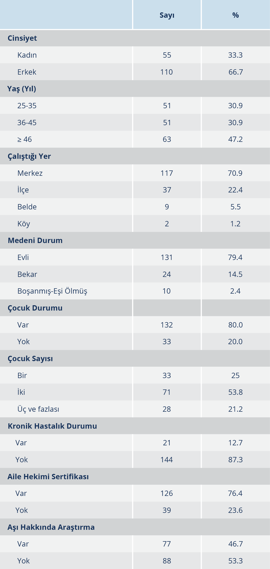 Çalışmaya katılan aile hekimlerinin %66.7’si erkek olup yaş ortalaması 40.67±8.85 (min.=25, maks.=63) olarak hesaplanmıştır. Katılımcıların %79.4’ü evli, %14.5’i bekar, %6’sı boşanmış, eşi vefat etmiş ve ayrı yaşayanlardan oluşup, %80’i çocuk sahibiydi. Katılanların %23.6’sı pratisyen hekim ve %76.4’ü aile hekimi sertifikasına sahip olarak aile hekimliği yapmaktaydı. Çalışmaya katılan aile hekimlerinin %70.9’u merkez, %22.4’ü ilçe, %5.5’i belde, %1.2’si köy yerleşiminde çalışmaktaydı. Katılımcıların %47.5’i aşının faydalı veya zararlı oluşu konusunda araştırma yapmıştı (Tablo 2).