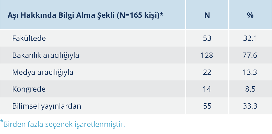 Katılımcıların %77.6’sı aşılar hakkındaki en son bilgilerini Sağlık Bakanlığı aracılığıyla elde etmişlerdi (Tablo 3).
