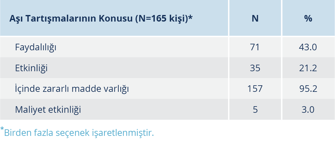 Katılımcılara medyada yer alan aşı tartışmalarının konusu kapsamındaki düşünceleri sorulduğunda, “Aşıların içinde zararlı madde varlığı” cevabı %95.2 oranıyla birinci sırada saptanmıştır (Tablo 4).
