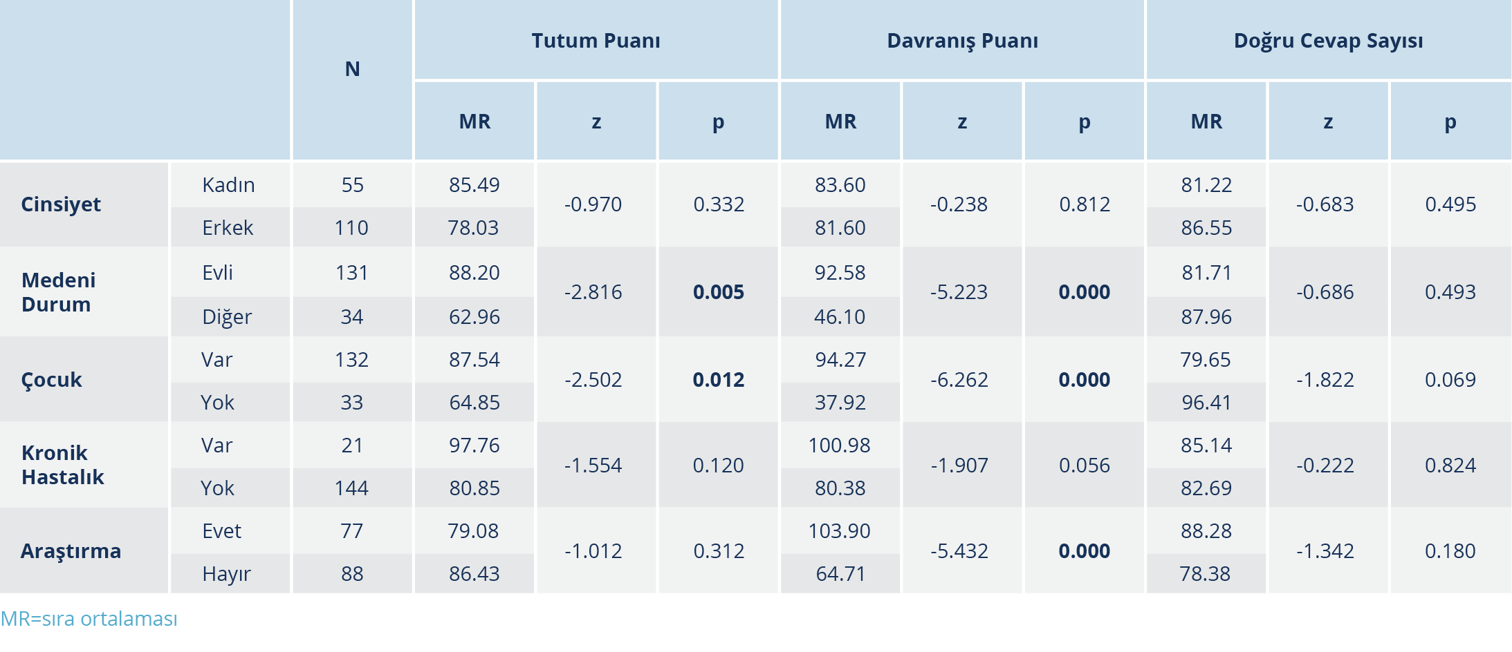 Evli olanların, çocuğu olanların ve 46-55 yaş grubundan olanların tutum ve davranış puanları, aşı hakkında araştırma yapanların ise davranış puanı daha yüksektir. Yaş ile, tutum ve davranış puanları pozitif ilişkilidir. Yaş ilerleyip evlilik ve çocuk olma durumu aşı yaptırma gerekliliği ile karşı karşıya kalma durumunu ortaya çıkarmış ve dolayısıyla bu durum tutum ve davranış puanına yansımıştır.