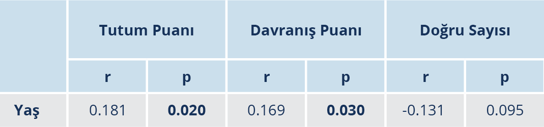 Davranış puanı, evlilerin evli olmayanlara göre (p<0.001), çocuğu olanların olmayanlara göre (p<0.001), araştırma yapanların yapmayanlara göre yüksekti (p<0.001). Kadın-erkek, kronik hastalık varlığı-yokluğu arasında davranış puanları açısından anlamlı fark yoktu (Tablo 5). Diğer gruplara göre 46-55 yaş grubunun davranış puanı yüksekti (p<0.001) ve yaş ile davranış puanı arasında Spearman korelasyon analizi ile pozitif yönlü ilişki bulundu (p=0.03) (Tablo 6). Ayrıca doğru sayısı ile tutum ve davranış puanı, tutum puanı ile davranış puanı ilişkili değildi (p>0.05).