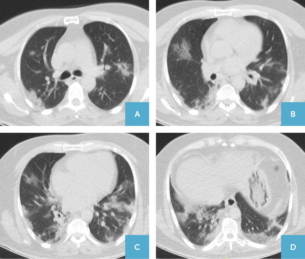 51 yaşında, sağlık çalışanı olan erkek hasta, kuru öksürük ve yaygın halsizlik şikayeti ile Kayseri Şehir Hastanesi Pandemi Polikliniği’ne başvurmuş ve COVID-19 öntanısı ile pandemi servisine yatırılmıştır. Bilinen 6 yıldır T2DM tanısı olan hasta, metformin (2000 mg/gün) kullanıyor olup başka ek hastalığı ve ilaç kullanım öyküsü yoktu. Yatışında kaydedilen kan basıncı 110/60 mm Hg, nabız 112 atım/dk, solunum sayısı 20 soluk/dk, ateş 37.2oC ve pulse oksimetre ile ölçülen oksijen satürasyonu %98 idi. Kan tetkik sonuçlarında; beyaz küre 3070 (4500-10000) µL/mm3, hemoglobin 17.6 (13-17) g/dL, trombosit 138000 (150000-450000) µL, nötrofil 2160 (1800-7500) µL, lenfosit 630 (800-3200) µL/mm3, BUN 14 (6-20) mg/dL, kreatin 0.95 (0.7-1.2) mg/dL, AST 49 (0-40) U/L, ALT 74 (0-41) U/L, CRP 4.5 (0-5) mg/dL, D-dimer (FEU) 350 (0-500) µg/L, glikoz (yatış anı, rastgele) 307 (70-200) mg/dL, HbA1c %9.1 (<6.5) olarak tespit edilmiştir. Kontrastsız toraks bilgisayarlı tomografi görüntülemesinde, her iki akciğerin tüm loblarında yaygın olarak santral ve periferik buzlu cam görünümleri ve bazılarında kaldırım taşı değişimi izlenmiştir (Resim 1). Hastaya, T.C. Sağlık Bakanlığı COVID-19 Tedavi Rehberi’ne göre; enoksaparin 0.6/gün IU subkutan, hidroksiklorokin tablet (başlangıç 800 mg/gün, idame 400 mg/gün) ve azitromisin tablet (başlangıç 500/gün mg, idame 250 mg/gün) başlanmıştır.