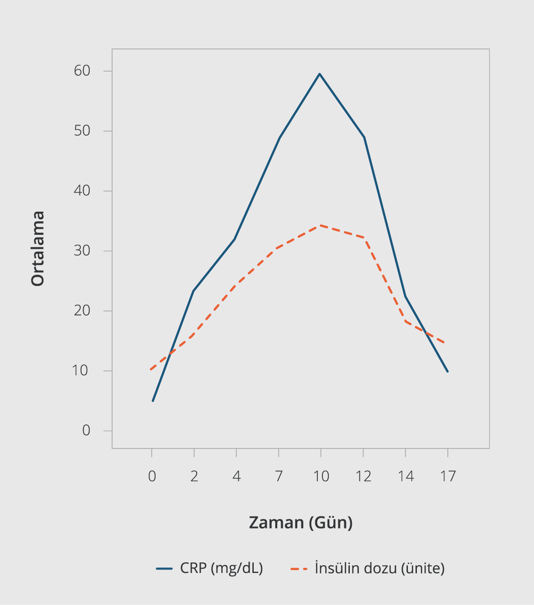Nazofaringeal sürüntü ile alınan gerçek zamanlı ters transkripsiyon polimeraz zincir reaksiyonu (rRT-PCR) tetkik sonucu pozitif (+) olarak sonuçlandı. Aynı zamanda altı saat arayla, parmak kapiller kan şekeri takibi yapılarak metformin tedavisine devam edildi. Hipoglisemi riskini düşük tutmak için sadece insülin glarjin U100 (IGlar100) ile diyabet tedavisine katkı sağlandı. IGlar100 tedavisi 12 ünite/gün olarak başlandı ve 4-6 ünite/gün olarak artırılarak, 28 ünite/gün dozuna kadar çıkıldı. Hastanın takiplerinde solunum sıkıntısı ve takipne (26 soluk/dk), yüksek ateş (38.3oC), artmış CRP (42 mg/dL) ve azalmış oksijen satürasyonu (%91) tespit edildi. Bunun üzerine tedaviye favipiravir tablet (başlangıç 3200 mg/gün, idame 1200 mg/gün) eklendi ve olası asidoz riski nedeniyle metformin durduruldu. Daha yoğun etkisi ve daha düşük hipoglisemi riski olan IGlar300 tedavisine geçilirken IGlar100 ise kesildi. Bu geçiş esnasında uygulanan insülin 28 ünite/gün ile başlandı ve takiplerde kan şekeri rehberlerdeki öneriler ışığında, açlık 100-140 mg/dL arasında ve tokluk 140-180 mg/dL arasında tutulmak üzere IGlar300 ile titrasyonu sağlandı. Bu amaçla yapılan izlemde, en fazla 34 ünite/gün insülin ihtiyacı oldu. Kapiller kan şekeri takibi, önce 12 saatte bir yapıldı ve ilerleyen süreçte günde bir şeklinde azaltıldı. İnfeksiyonun alevli dönemlerinde IGlar300 ihtiyacı fazla olan hastada, infeksiyon kontrol altına alındıkça ihtiyaç olan insülin dozu 14 ünite/gün seviyesine kadar geriledi (Şekil 1). Genel durumu düzelen ve infeksiyonu kontrol altına alınan hastanın diğer tüm medikal tedavileri sonlandırılarak, uzaktan video-görüşme şeklinde verilen diyabet eğitimi sonrası metformin ve IGlar300 ile taburculuğu yapıldı.