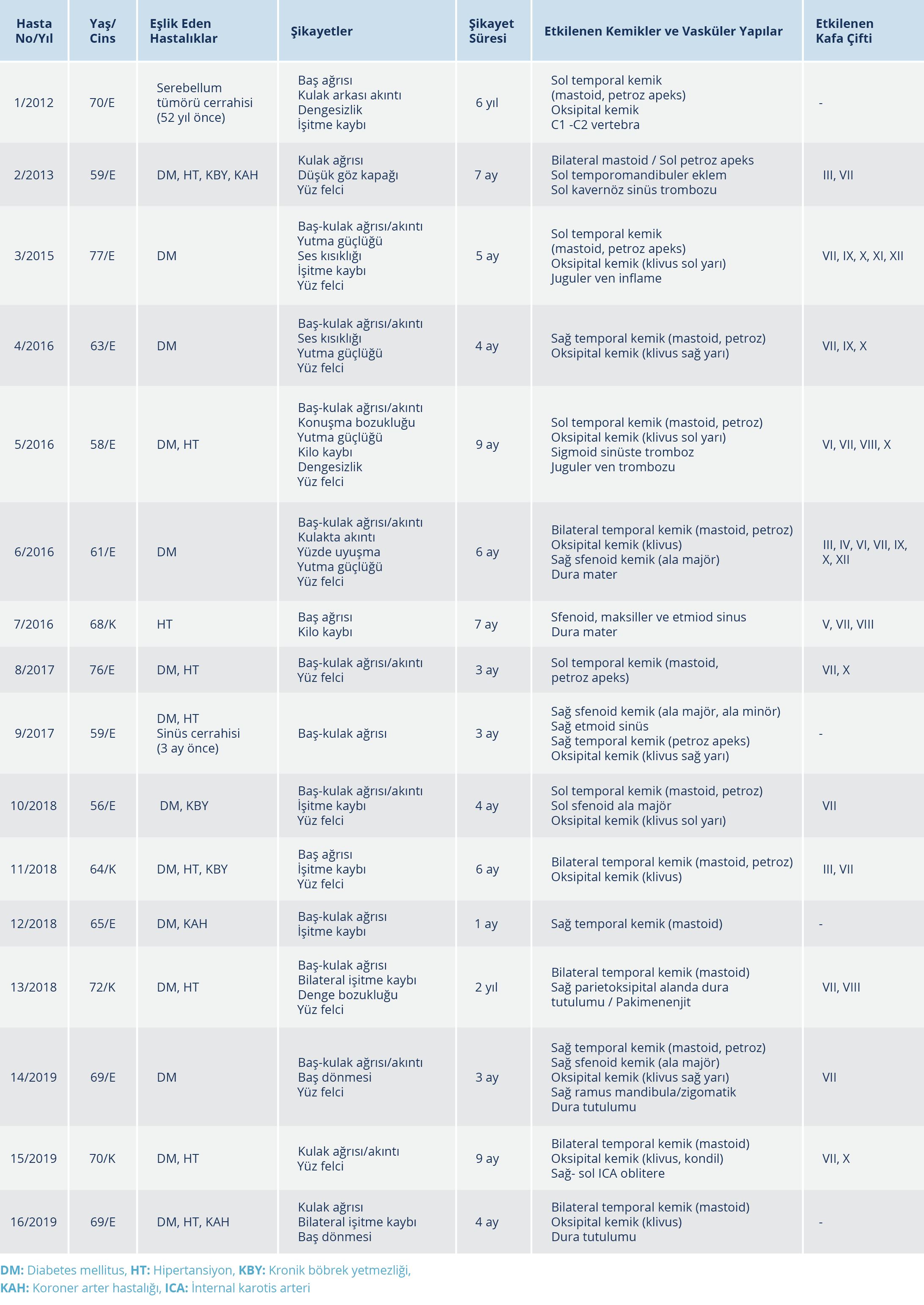 On üç hasta otojenik, 2 hasta sinüs (biri sfenoid sinüs cerrahisi sonrası) kaynaklı ve 1 hasta oksipital kemik cerrahi zemininde gelişen KTO’ydu. Hastaların 8’inde bilateral, 5’inde sol, 3’ünde ise sağ taraf tutulumu vardı. En çok etkilenen kemikler sırasıyla; temporal (mastoid (14/16), petröz (11/16), oksipital (klivus (11/16), sfenoid (ala majör (5/16), ala minör (1/16), etmoid (2/16), C1 ve C2 vertebra (1/16) idi. Vasküler komplikasyon olan 4 hastanın 3’ünde juguler ven inflamasyon/trombozu±sigmoid sinüs trombozu ve 1’inde kavernöz sinüs trombozu saptandı. Bir hastanın internal karotis arteri, bilateral oblitere ve inflameydi. Dura tutulumu, 5 hastada eşlik etmekteydi.