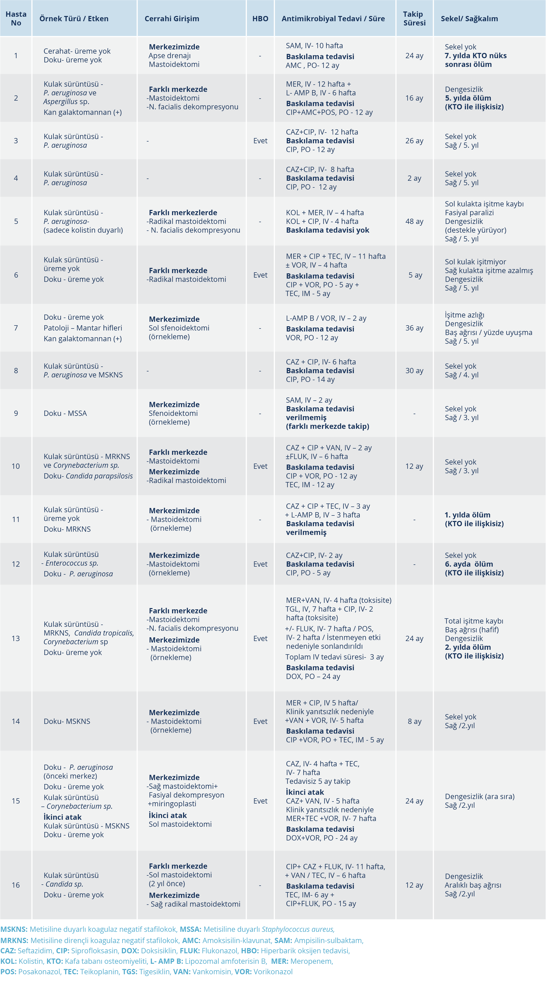 Bulgular: Toplam 16 KTO olgusunun yaş ortalaması 66 olup, %75’i erkekti, %87.5’inde diabetes mellitus tanısı vardı. Hastaların %75’inde kafa çifti tutulumu olup, %56.3’ü vasküler veya dura tutulumuyla komplike olan olgulardı. En sık üreyen etken P. aeruginosa, ikinci sıklıkta stafilokoklar ve üçüncü sırada Candida spp’ydi. Hastaların %81.2’si anti-Pseudomonas, %43.7’si ilave glikopeptid, %56’sı antifungal tedavi aldı. Yirmi dört aylık takipte %46.7 oranında sekel saptandı. Kalıcı sekel için hipertansiyon (p=0.041), şikayet süresi (p=0.003), kafa tabanı kemiklerin iki taraflı tutulumu (p=0.001), vasküler tromboz/inflamasyon veya dura tutulumu (p=0.007), daha önce farklı merkezde cerrahi müdahale yapılmış olması (p= 0.041) ve tedavi sonu eritrosit sedimantasyon hızı (ESR)’nın yüksekliği (p=0.014) risk faktörü olarak tanımlandı. Hastane içi mortalite yoktu.