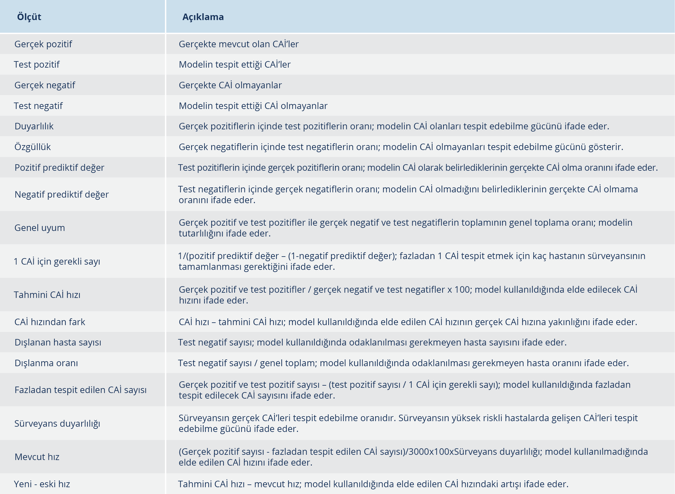 Hastaların CAİ gelişme riskini belirlemek için oluşturulan lojistik regresyon modelinden elde edilen formül ile her hasta için bireysel CAİ gelişme olasılığı belirlenmiştir. Modelin istikrarı Bootstrap yeniden örnekleme yöntemiyle test edilmiştir. Yüksek riskli hastaları ayırmada kullanılacak eşik olasılık ROC analizi ile belirlenmiştir. Farklı CAİ hızları olan hastaneler ve CAİ’leri yakalama kapasitesi (sürveyans duyarlılığı) farklı olan hastaneler için Tablo 1’de yer alan ölçütler kullanılarak çalışmada belirlenen eşik olasılıktan yüksek olasılığa sahip yüksek riskli hastalara odaklanmanın faydası değerlendirilmiştir.