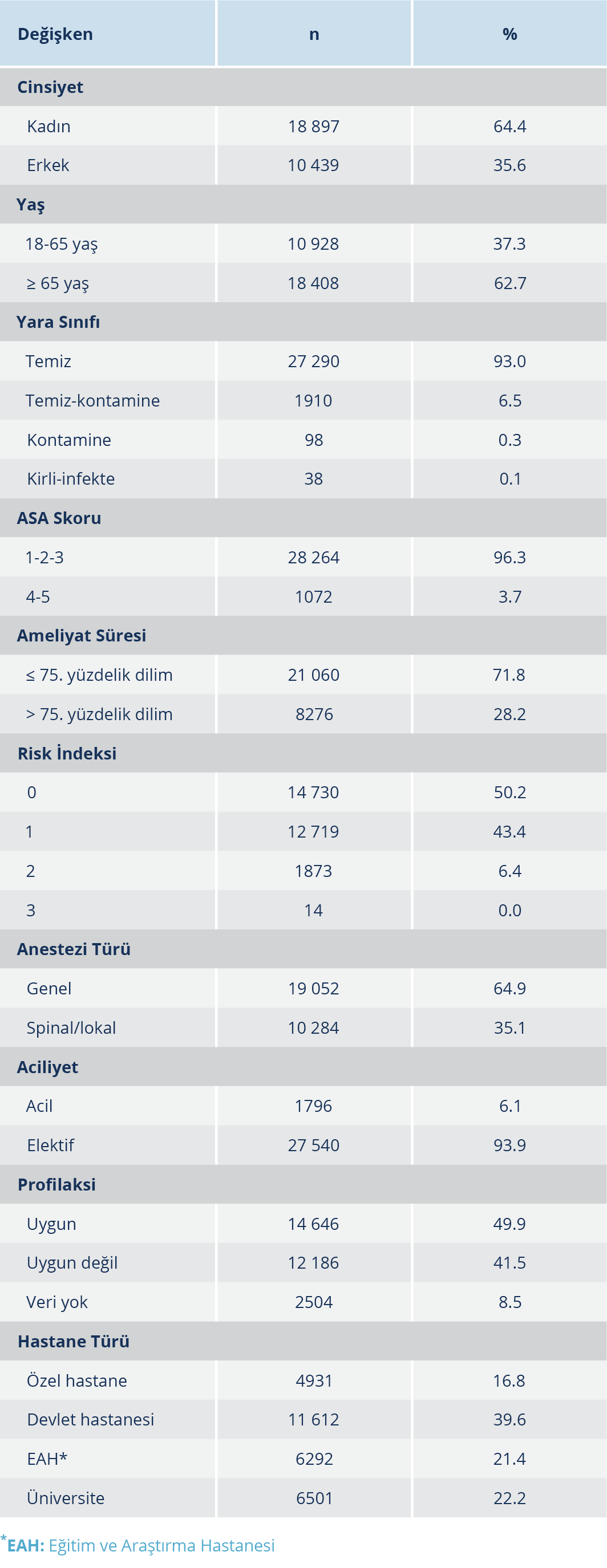 Çalışmaya toplam 29 336 ameliyat dahil edilmiştir. Hastaların yaş ortalaması 68.1±15.5 yıl ve ortalama ameliyat süresi 112.6±49.6 dakikadır. Ameliyatlara ait değişkenlerin dağılımı Tablo 2’de gösterilmiştir.