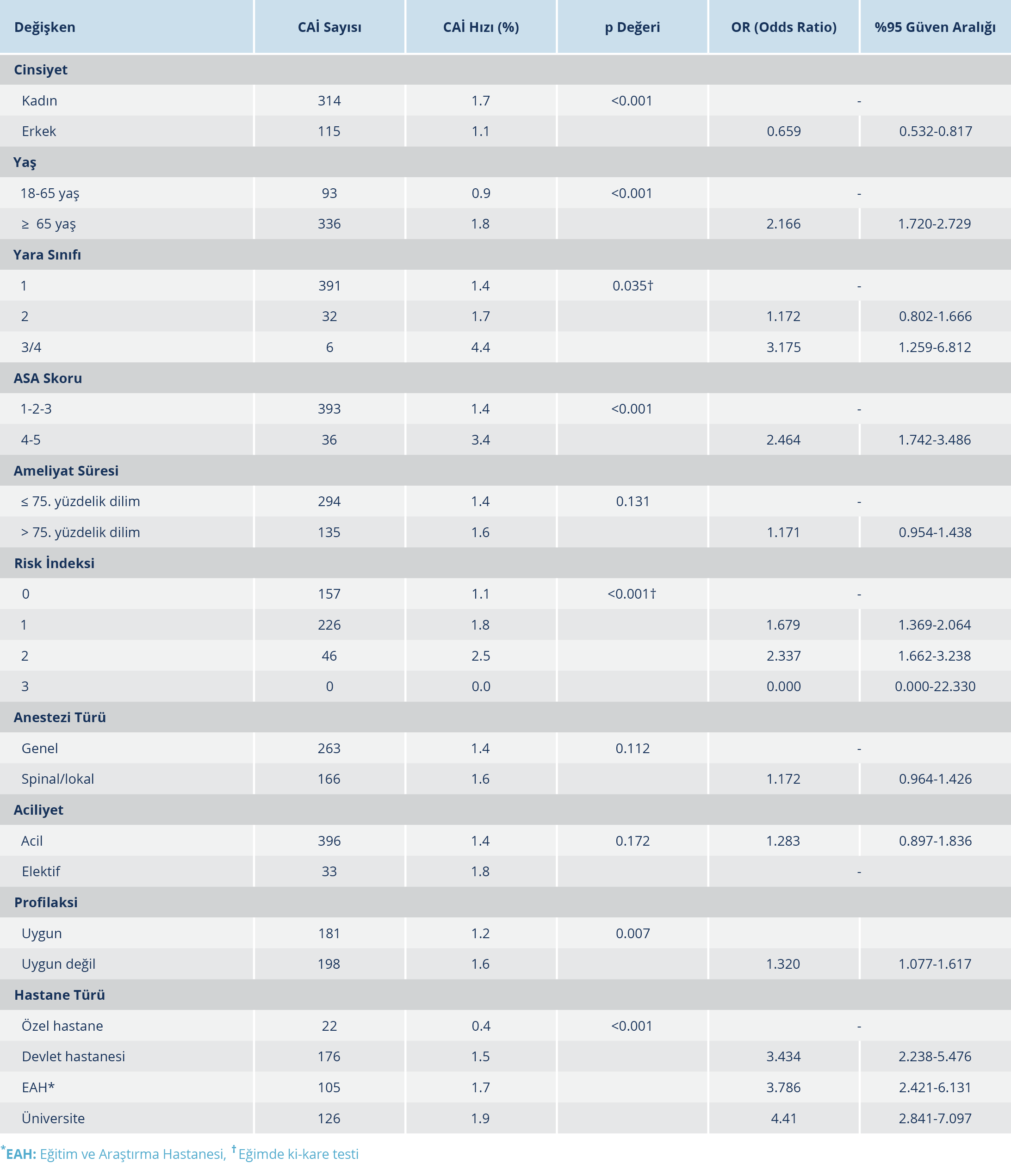 Bu ameliyatlarda toplam 429 CAİ tespit edilmiş olup CAİ hızı 1.44 bulunmuştur. CAİ’lerin %24.0 (n=103)’ı primer yüzeyel insizyonel CAİ, %46.2 (n=198)’si primer derin insizyonel CAİ ve %29.8 (n=128)’i organ-boşluk tipi CAİ’dir. CAİ gelişimi için tek değişkenli analizlerin sonuçları Tablo 3’de gösterilmiştir.