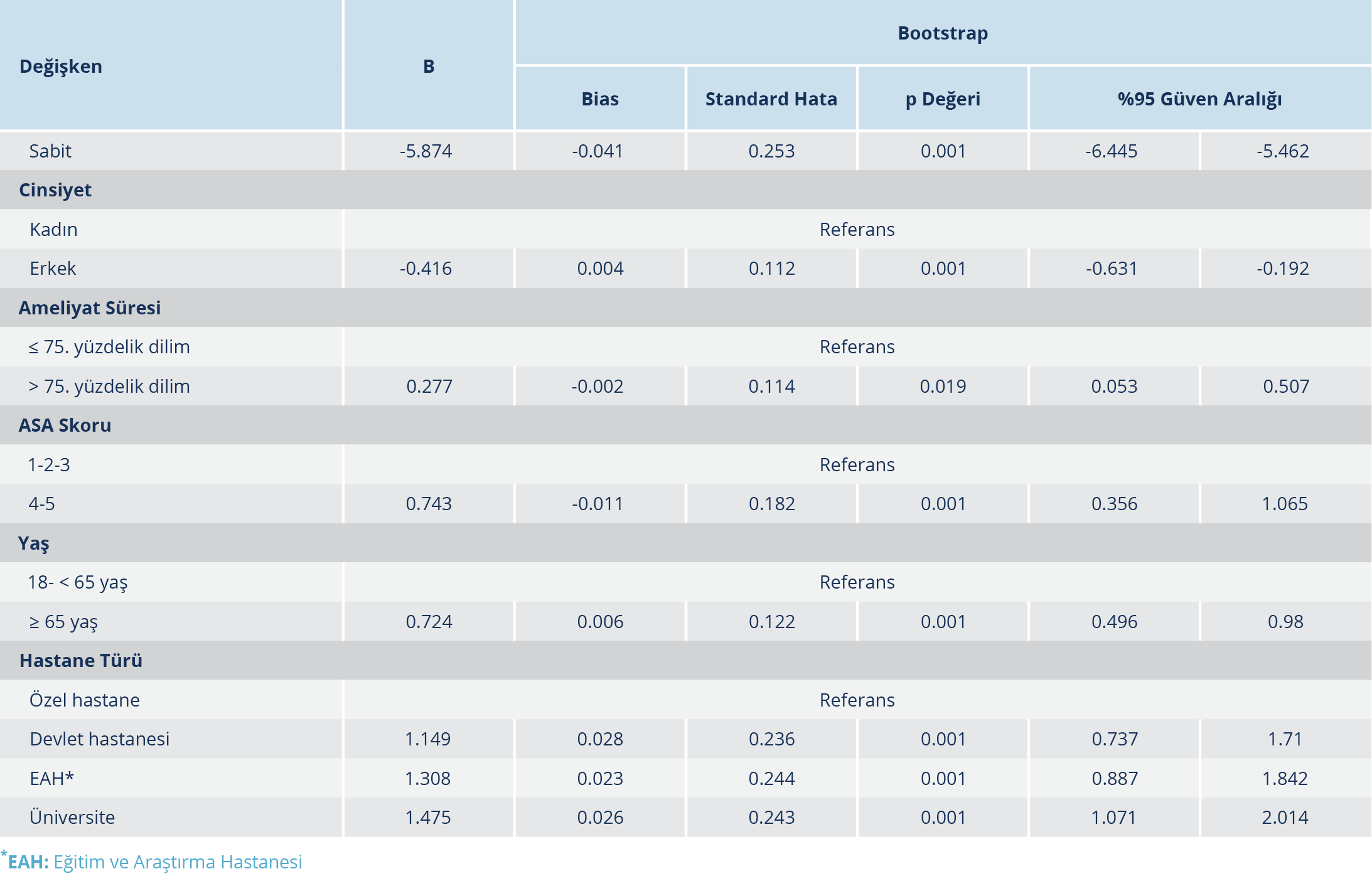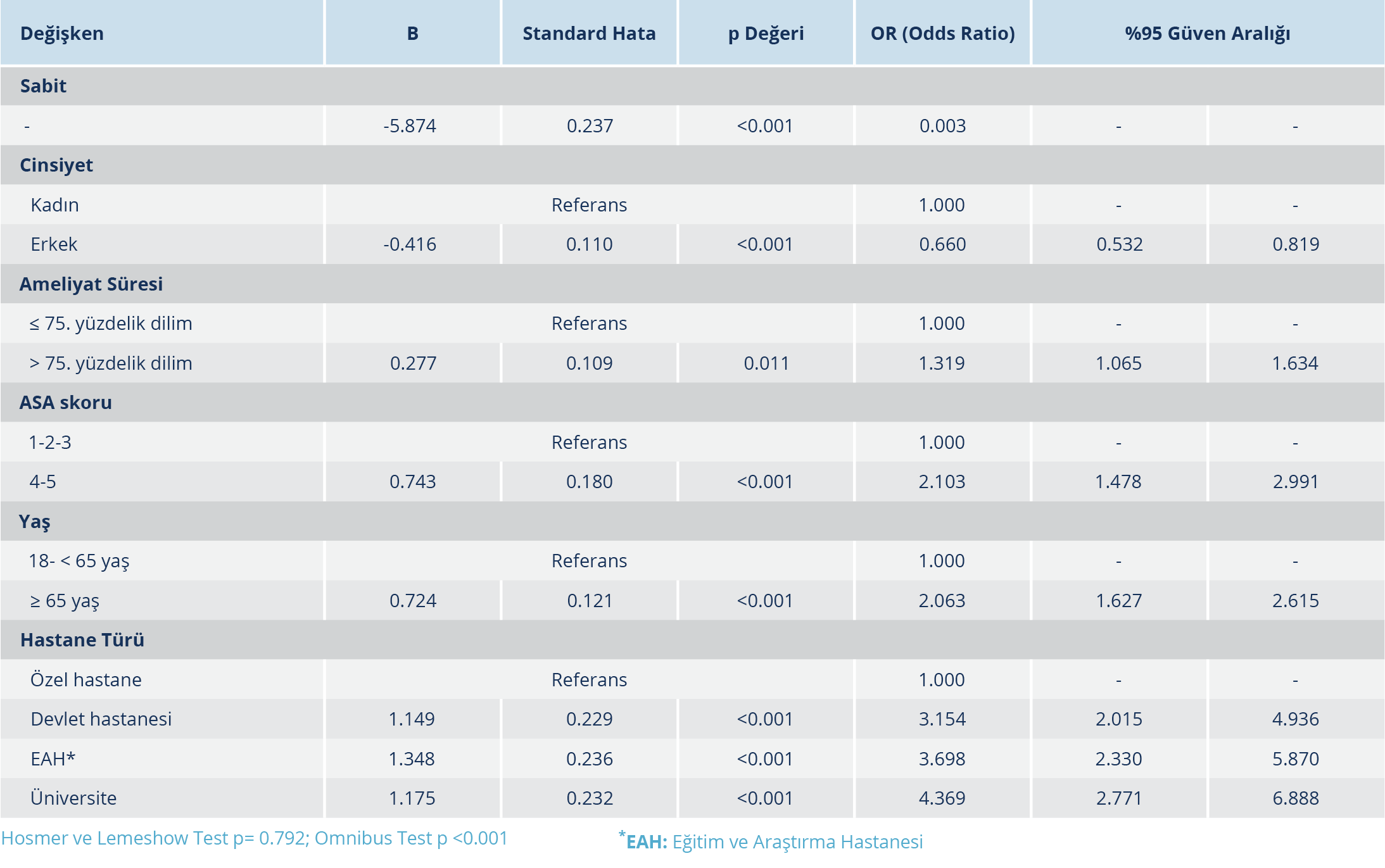logit (p̂) = [-5.874 -0.416 (Cinsiyet = Erkek) + 0.277 (Ameliyat süresi = 75. yüzdelik dilimden uzun) + 0.743 (ASA skoru = 4-5) + 0.724 (Yaş = ≥65) + 1.149 (Hastane türü = Devlet hastanesi) + 1.348 (Hastane türü = AEH) + 1.175 (Hastane türü = Üniversite)]