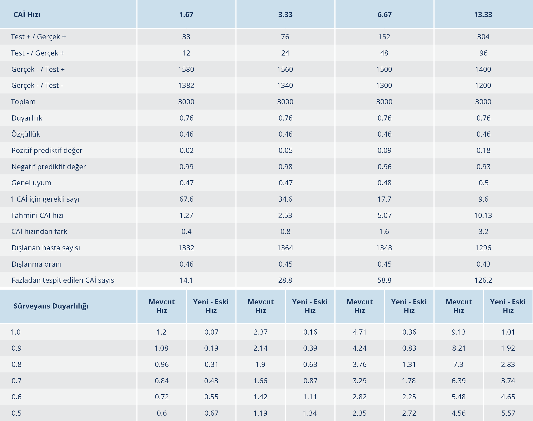 Çalışmada oluşturulan model kullanılarak belirlenen yüksek riskli hastaların sürveyansına odaklanıldığında bir hastanenin gerçek CAİ hızı yükseldikçe, 1 CAİ daha tespit edilmesi için ulaşılması gereken hasta sayısı belirgin şekilde azalmaktadır. Sürveyans duyarlılığı azaldıkça elde edilen yeni hız eski hızdan daha büyük farklılık göstermiş ve gerçek CAİ hızına yaklaşma miktarı artmıştır. CAİ hızı arttıkça pozitif ve negatif prediktif değer, genel uyum, dışlanan hasta sayısı ve dışlanma oranında belirgin farklılık gözlenmezken fazladan tespit edilen CAİ sayısı katlanarak artmıştır.