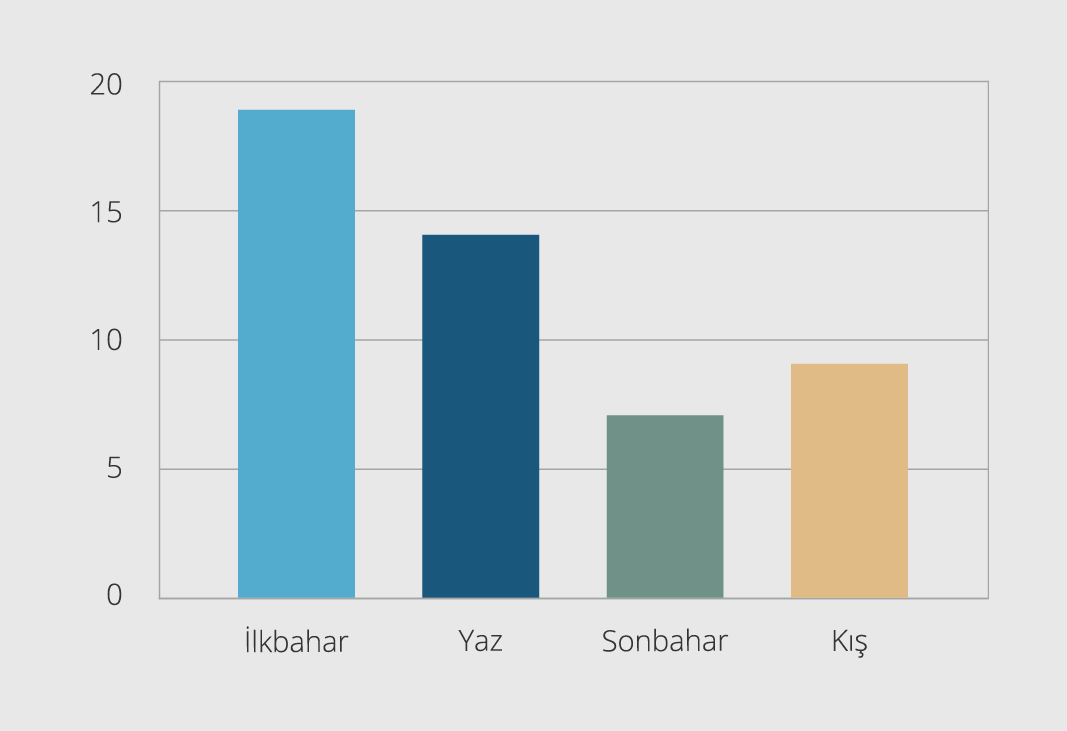 Mevsimsel değişiklikler açısından değerlendirildiğinde; olguların %38 (n=19)’inde semptomlar ilkbahar aylarında görülürken, %28 (n=14)’i yaz aylarında, %32 (n=16)’si sonbahar ve kış aylarında saptandı (Şekil 2). Akut ve subakut bruselloz olarak sınıflandırılan 33 hastanın 24 (%72.7)’ünün ilkbahar ve yaz aylarında başvurduğu, relaps olan 10 hastanın 6 (%60)’sının sonbahar ve kış aylarında başvurduğu belirlendi.