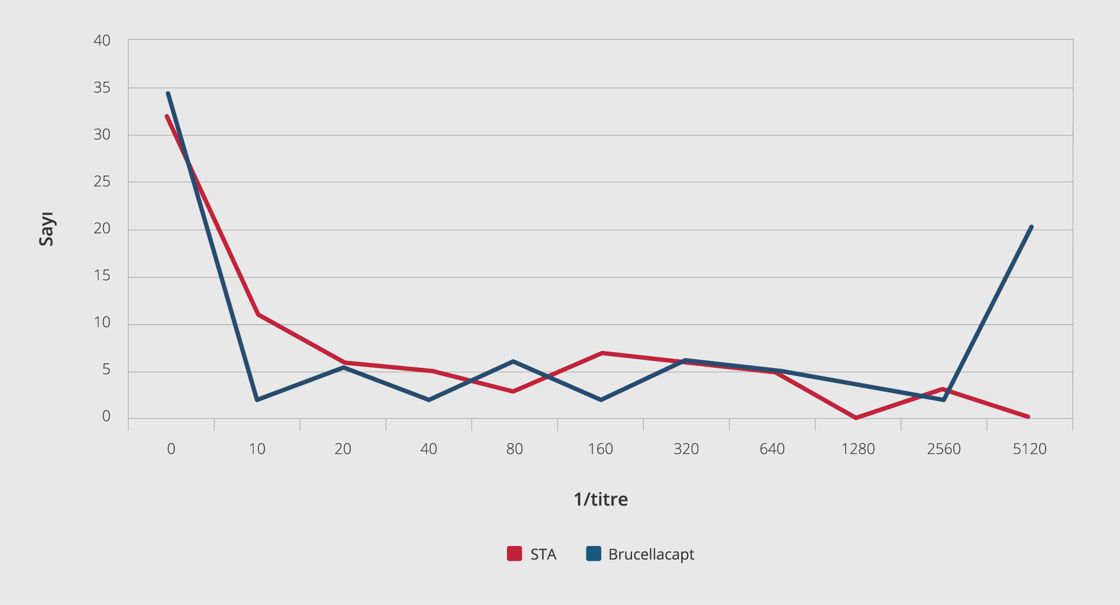Toplam 49 hastanın 21 (%42.8)’inde STA testi, 36 (%73.4)’sında Brucellacapt, 33 (%67.3)’ünde ELISA IgG, 33 (%67.3)’ünde ELISA IgM ve 31 (%61.2)’inde ELISA IgA ile pozitiflik saptandı. STA testinin pozitiflik oranı diğer testlerle karşılaştırıldığında oldukça düşüktü. STA testi ile pozitif bulunan serumdaki titreler, Brucellacapt ile daha yüksek saptandı. Kontrol grubuna ait 30 örneğin hepsinde STA, Brucellacapt ve ELISA IgA testleri negatifken, 4 (%13.3) kişide ELISA IgG, 3 (%10) kişide ELISA IgM düşük pozitif bulundu.