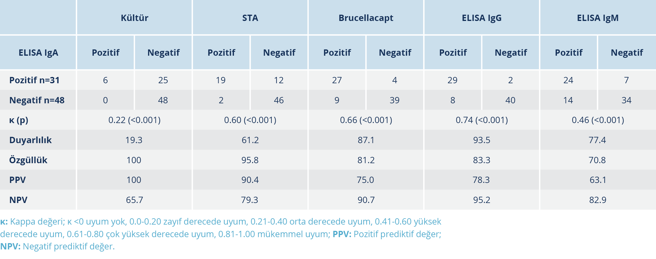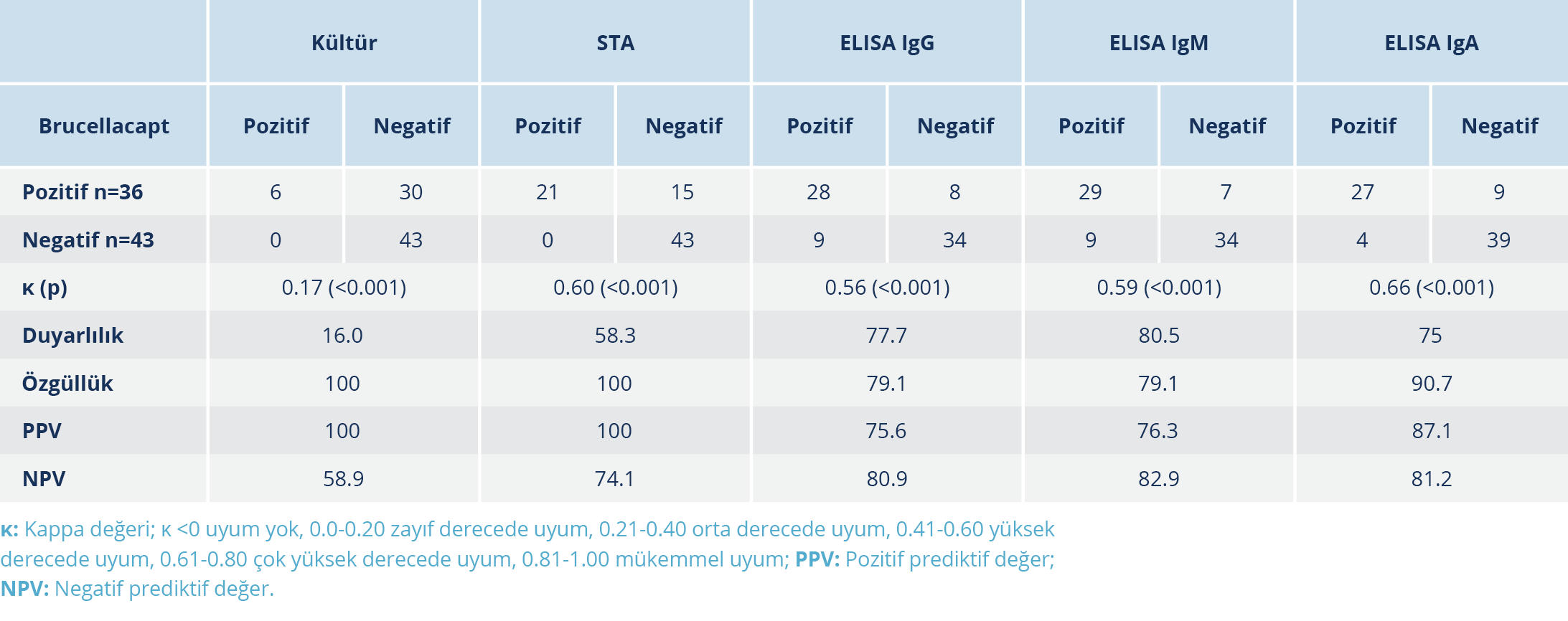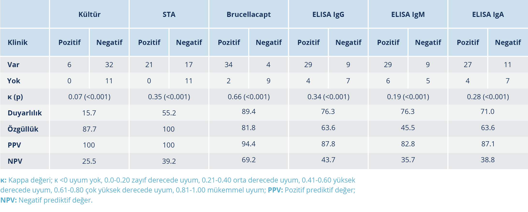 Sadece kan kültürü pozitifliği dikkate alındığında, testlerin duyarlılıkları; STA için %83.3, Brucellacapt için %100, ELISA IgG için %83.3, ELISA IgA için %100, ELISA IgM için %100 olarak hesaplandı. Kan kültürü ile serolojik test sonuçları karşılaştırıldığında STA testi (κ=0.28) ve ELISA IgA (κ=0.22) ile orta derecede uyum saptanırken, diğer testlerle istatistiksel olarak zayıf derecede uyum saptandı (p<0.001) (Tablo 3).