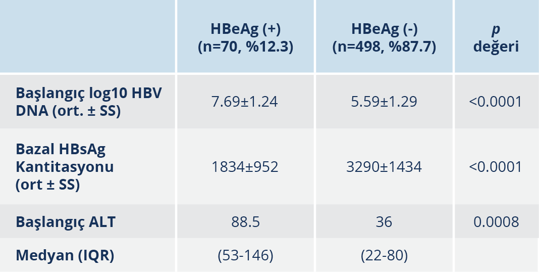 Hastaların başlangıç HBV DNA (kopya/ml) ortalaması 71 573 590 ± 221 752 936 iken, LdT ve LAM grubunda, başlangıç HBV DNA düzeyi ortalaması ve log10 HBV DNA ortalama düzeyi diğer tedavilere göre istatistiksel anlamlı olarak düşük bulundu (p<0.0001). HBeAg durumuna bakılmış olan 568 hastanın 70 (%12.3)’i HBeAg (+), 498 (%87.7)’i HBeAg (-) idi. HBeAg’ ye göre tedavi öncesi virolojik ve biyokimyasal değerlerin kıyaslanması Tablo 2’de gösterilmiştir.