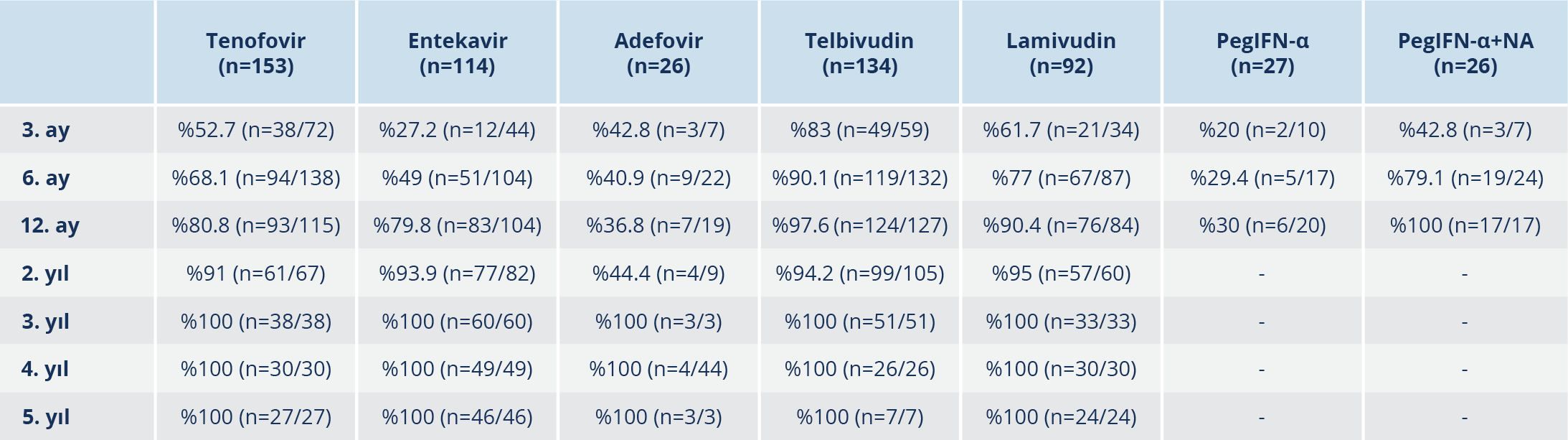 Tedavi grupları arasında HBV DNA’nın zaman içerisindeki seyrinin farklı olduğu görüldü (p<0.0001). En hızlı HBV DNA düşüşünün TDF ve ETV’de olduğu, ADV grubunda diğer gruplara göre HBV DNA’daki düşüşün daha geç olduğu ve PEG-IFN-α+NA tedavisinde virolojik yanıtın PEG-IFN-α monoterapisine kıyasla daha kısa süre içinde olduğu Şekil 1’de; tedavi türlerine göre virolojik yanıt oranları Tablo 3’te gösterilmiştir.
