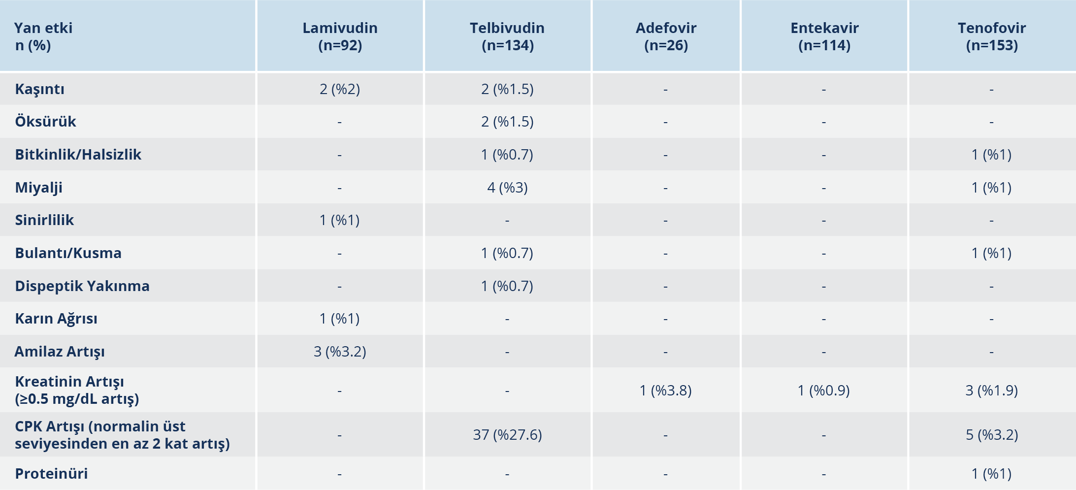 Hastaların 169 (%29.5)’unda en az bir yan etki olup, en az yan etki TDF’de %7.8 (12/153) ve ETV’de %7.9 (9/114) oranında görüldü; bu iki grup arasında yan etki açısından istatistiksel olarak anlamlı fark bulunmadı (p>0.05). Tedavi esnasında en az bir yan etki, PEG-IFN-α+NA’da %92.3, PEG-IFN-α’da %77.8, LAM’da %47.8, LdT’de %40.3, ADV’de %19.2 oranlarında tespit edildi.