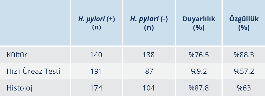 Çalışmaya alınan 278 hastanın 140’ının kültüründe üreme saptandı; 174’ünde histoloji ile pozitiflik tespit edildi. Ayrıca HÜT ile 191 hastada H. pylori pozitifliği görüldü. Altın standard kriterine göre kültür yöntemiyle 39, histoloji ile 17 ve HÜT ile 8 olguda yalancı negatif sonuç saptandı. Hastaların kültür, histoloji ve HÜT yöntemleri için duyarlılık oranları sırasıyla %76.5 ve %88.3, %87.8 ve özgüllükleri %63, %94.2 ve %57.2 olarak tespit edildi (Tablo 1).