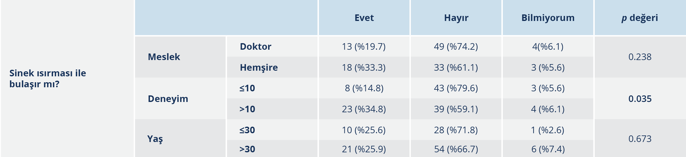 “Sivrisinek sokması” ile bulaşacağı düşüncesi, deneyimi 10 yıl üzerinde olanlarda anlamlı olarak fazlaydı (p=0.035). Bulaşı önlemek adına alınması gereken önlemleri sorgulayan soruya “standard temas” önlemleri cevabını verenler, hekimlerin %34.8’ini ve hemşirelerin %38.9’unu oluşturmaktaydı. Hekimler, hemşirelerle karşılaştırıldığında (%12.1’e karşılık %1.9, p=0.043) istatistiksel olarak anlamlı fark oluşturacak şekilde, korunmada “damlacık” izolasyonuna da gerek olduğunu işaretlemişlerdi.