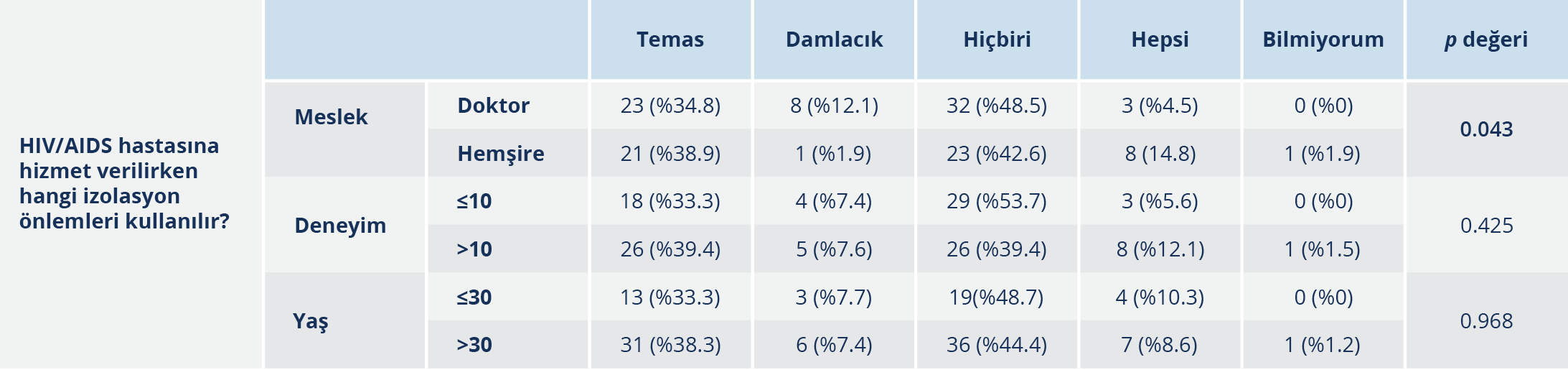 Katılımcıların tümünün HIV/AIDS’in cinsel temas ve kan yolu ile bulaştığını, %99.2’sinin damar içi madde bağımlılığı/ortak enjektör kullanımı nedeniyle ve %98.3’ünün anneden bebeğe doğum esnasında bulaşacağını bildiği görüldü. “Kan bulaşı olabilecek kişisel malzemelerin ortak kullanımı ile hastalık bulaşır mı?” sorusuna katılımcıların yarıya yakını “evet” yanıtı verdi; verilen doğru ve yanlış cevaplarda meslek, deneyim ve yaş grupları arasında anlamlı fark gözlenmedi (p=0.317, p=0.317, p=0.159). “Emzirme ile bulaşır mı?” sorusuna “evet” cevabını verenler, hemşire grubunda %77.8 ile anlamlı oranda fazlaydı (p=0.010). Katılımcılar meslek, deneyim ve yaş grupları arasında anlamlı fark olmaksızın hastalığın “tokalaşma” (p=0.609, p=0.845, p=0.697) ile bulaşmadığını bilmekteydi. Hekimlerin %37’si, hemşirelerin ise %55’i “öpüşme”; hekimlerin %19’u, hemşirelerin %33’ü “sivrisinek sokması” ile HIV bulaşacağını düşünmekteydi.