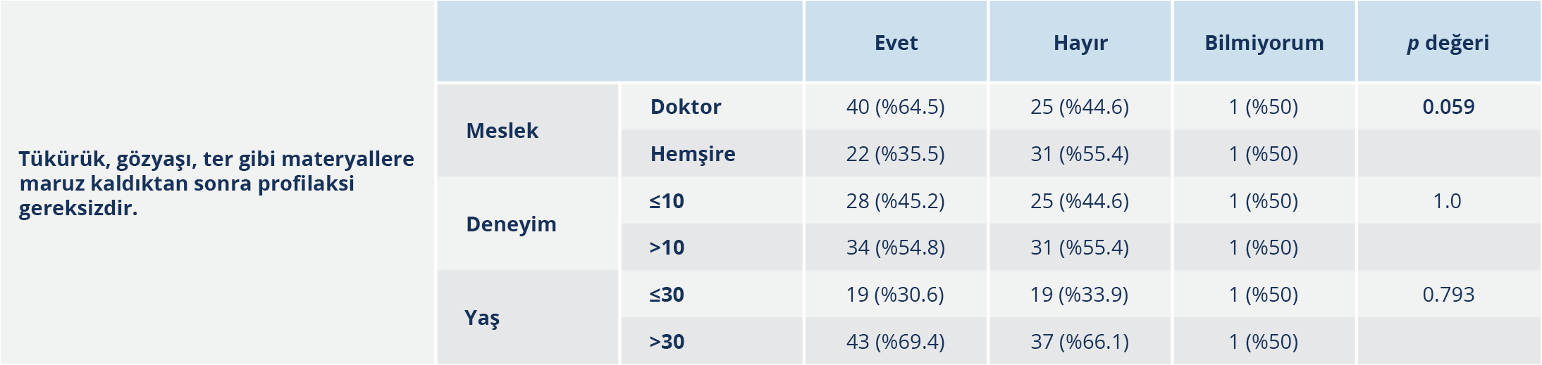 Hekimlerin %57’si, hemşirelerin ise %43’ü mesleki bir maruziyet durumunda ilk iki saatte başlanan profilaksinin hastalığı önlemede etkili olduğunu biliyordu. Gruplar arasında fark yoktu.