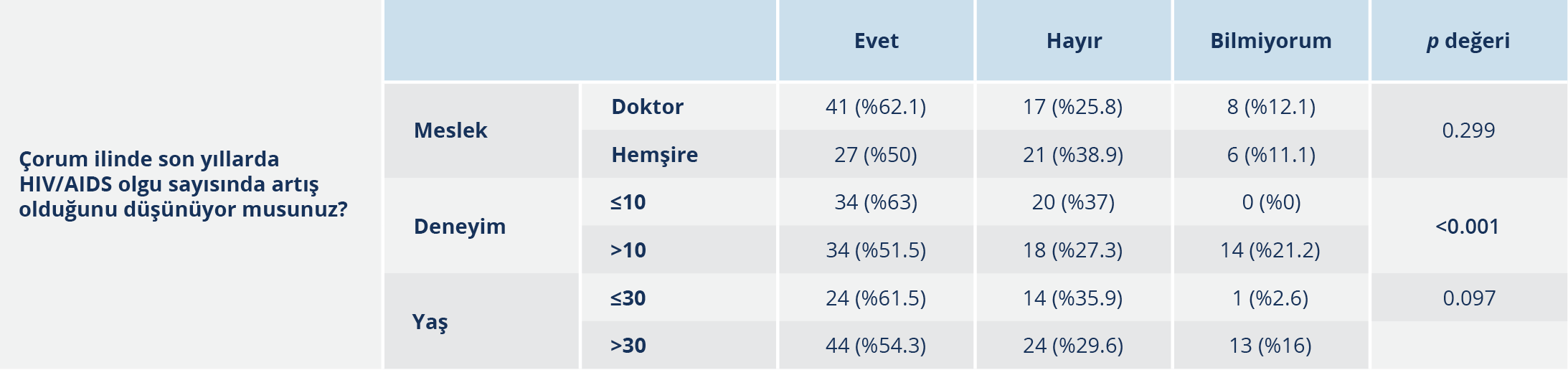 Hekimlerin %62’si, hemşirelerin ise %50’si Çorum ilinde HIV/AIDS olgu sayılarında artış olduğunu düşünüyordu. “İlimizdeki HIV/AIDS olgu sayılarında artış var mı?” sorusuna “bilmiyorum” diye yanıt verme oranı, mesleki deneyimi 10 yılın üzerinde olanlarda anlamlı düzeyde yüksekti (p<0.001).