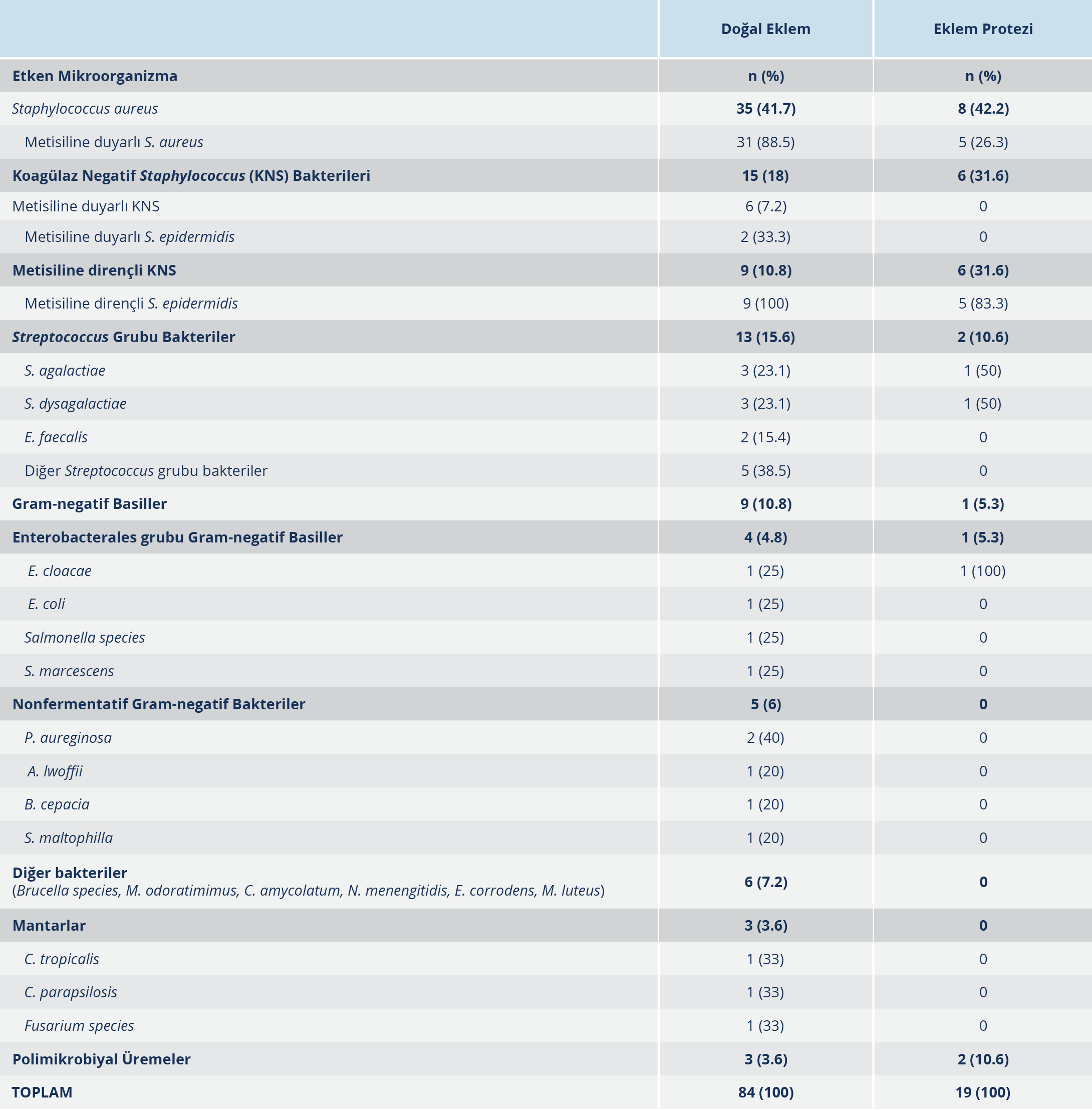 Bulgular: Araştırmaya, toplam 103 hastaya ait örnekler dahil edildi. Değerlendirmeye dahil edilen hastaların 19’unda eklem protezi öyküsü mevcutken 84 hastada doğal eklem tutulumu vardı. Genel olarak, S. aureus her iki grupta da %41.7 ve %42.2 oranlarıyla ilk sırada olup koagülaz negatif stafilokok (KNS) ve streptokoklar sırasıyla ikinci ve üçüncü sıradaydı. Gram-negatif basiller, doğal eklemlere ait numunelerde %10.8 ile dördüncü sırada iken protez öyküsü olan hastalara ait numunelerde sadece bir adet (%5.3) tespit edildi. Bununla birlikte, doğal eklem tutulumu ile protez öyküsü olan hasta örnekleri arasında üretilen mikroorganizmaların dağılımları yönünden istatistiksel olarak anlamlı bir fark bulunamadı (p>0.05). MRSA izolatlarının hiçbirinde vankomisin, teikoplanin, linezolid, daptomisin ve tigesikline karşı direnç tespit edilmedi. Metisiline dirençli koagülaz-negatif stafilokok (MRKNS) izolatlarında ise vankomisin, tigesiklin ve trimetoprim/sulfametoksazole karşı dirençli herhangi bir izolat görülmedi.