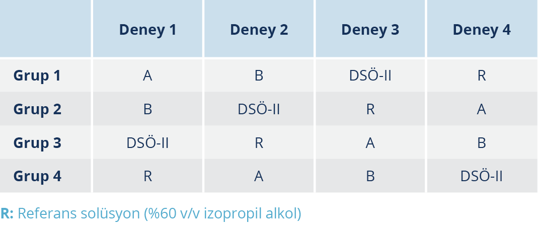 Her bir sette, bütün gönüllülerin 3 adet antiseptiği ve referans solüsyonu (R) kullandıkları bir Latin kare dizaynı uygulandı. Bunun için gönüllüler dört gruba ayrıldı (4+4+4+3 kişi) ve böylece her bir set dört deney yapılarak tamamlandı. Set 1’de uygulanan Latin kare dizaynı Tablo 2’dedir.