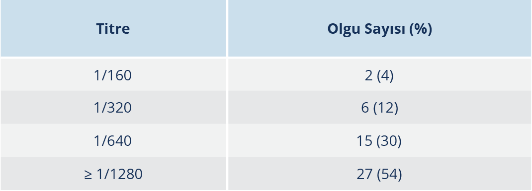 Tularemi şüphesiyle referans laboratuvarına serum örneği gönderilen 87 hastanın 50 (%57.4)’sinde F. tularensis MAT 1/160 titre ve üzerinde saptandı (Tablo 1). Tularemi olgularının %52’si erkek, yaş ortalaması 23’tü; 22 (%44) hasta ise 18 yaş ve altındaydı. Hastaların şikayetlerinin başlangıcından sonra hastaneye başvuru süresi ortalama 23 gündü (3-79). LAP (%100), boğaz ağrısı (%78), halsizlik (%66) ve iştahsızlık (%60) hastalığın başlangıcında en sık rastlanan belirti ve bulgulardı (Tablo 2).