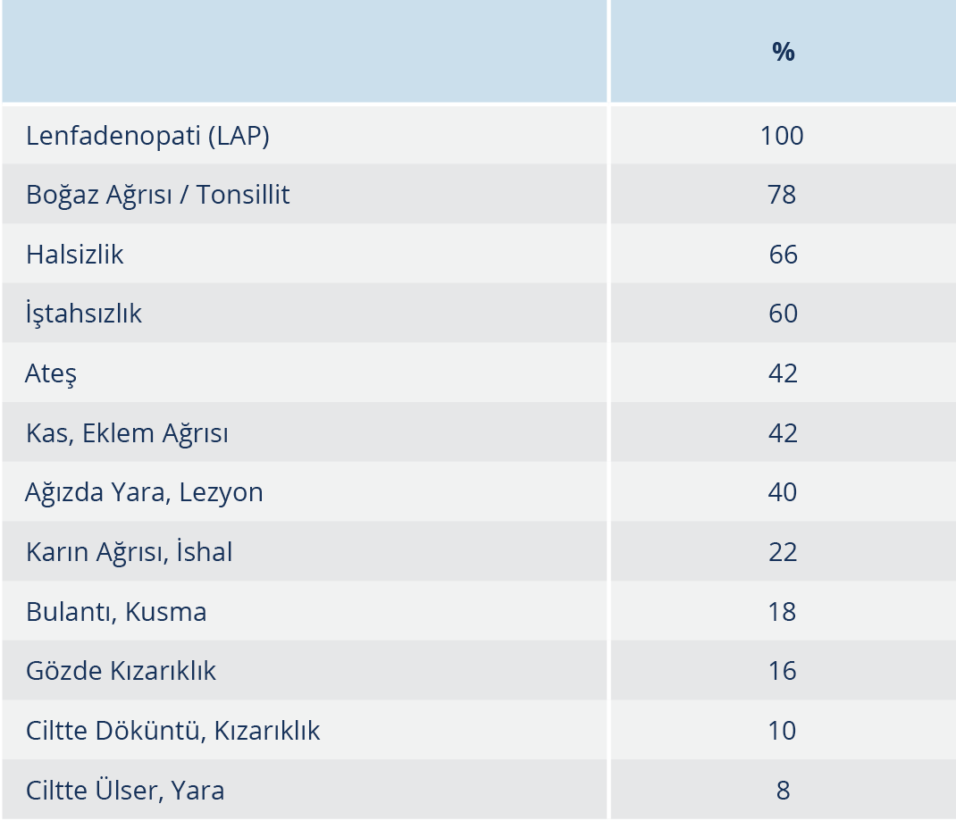 LAP, hastaların tümünde izlendi; boğaz ağrısı ve/veya tonsillit hastaların %78’inde eşlik ediyordu ancak ilk başvuruda ateş hastaların yarısından azında görüldü. Ülkemizden bildirilen diğer olgularda olduğu gibi hastalarda en sık orofarengeal form görüldü. Türkiye’den bildirilen en fazla hasta sayılı olgu serisinde %83 orofarengeal form görülmüş; LAP %85, boğaz ağrısı %58 ve ateş %66 oranında saptanmıştır (22). Ülkemizdeki diğer tularemi çalışmalarında da ateş görülme oranı %58-%94 arasında değişmektedir (4, 5, 9, 16-19, 21). Samsun’dan 2019 yılında bildirilen bir çalışmada da çalışmamızla benzer olarak hastaların başvuru süresi ortalama 23.4 gün olarak saptanmış; başvuruda ateş görülme oranı %18.8 ile daha düşük bulunmuştur (6). Hastaların geç başvurması, tanıda gecikmeler nedeniyle sadece LAP ile başvurabilecekleri, ateşin görülmeyebileceği unutulmamalıdır. Tularemide, hastalığa özgü olmayan halsizlik, iştahsızlık gibi şikayetler de yaygın olarak görülebilir.