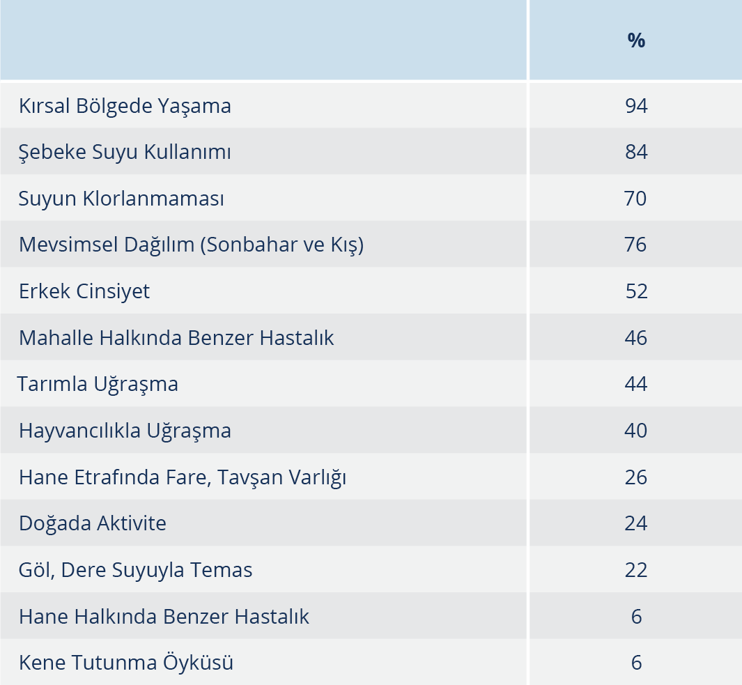Bulgular: Tularemi şüphesi olan 87 hastanın 50’sinde F. tularensis MAT 1/160 titre ve üzerinde saptandı. Olguların %52’si erkek ve yaş ortalaması 23 (3-66)’tü; %44’ü 18 yaş ve altındaydı. Hastaneye başvuru süresi ortalama 23 gündü (3-79). Lenfadenopati (LAP) (%100), boğaz ağrısı (%78), halsizlik (%66) ve iştahsızlık (%60) hastalığın başlangıç evresinde en sık rastlanan semptom ve bulgulardı. Olguların çoğunda orofarengeal form (%90) görüldü. Hastaların %96’sı kırsal bölgede yaşamakta ve %84’ü içme suyu olarak şebeke suyu kullanmaktaydı. Şebeke suyu klorlanma oranı %30’du. Olguların çoğu (%76) sonbahar ve kış mevsiminde görüldü. Mahalle halkında %46 oranında benzer hastalık vardı. Hastalarda mortalite izlenmedi.