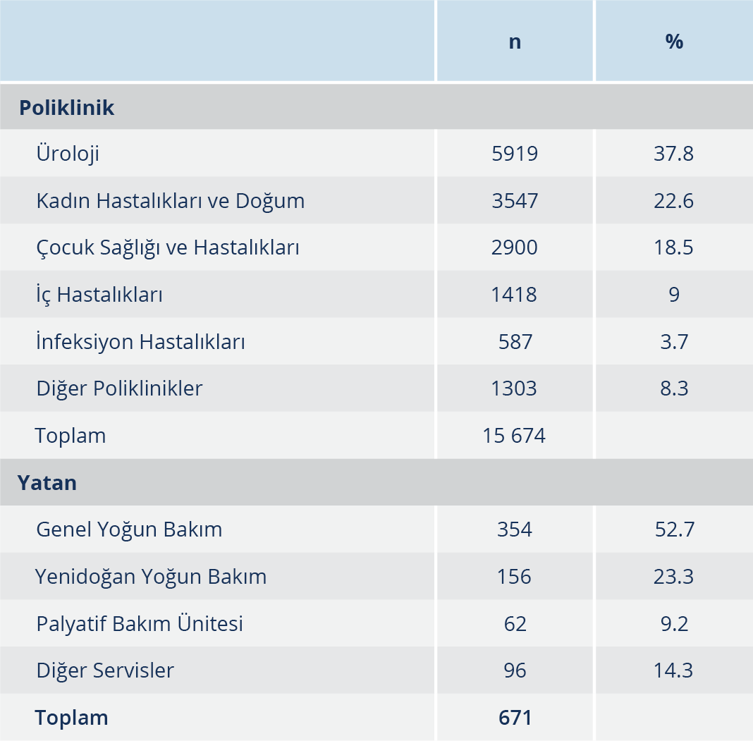 Çalışma süresince, 15 674’ü polikliniklerden, 671’i yataklı servislerden olmak üzere toplam 16 345 hastaya ait 16 521 idrar örneği laboratuvarımıza gönderilmiştir. Hastaların polikliniklere ve yataklı servislere göre dağılımları Tablo 1’de verildi.