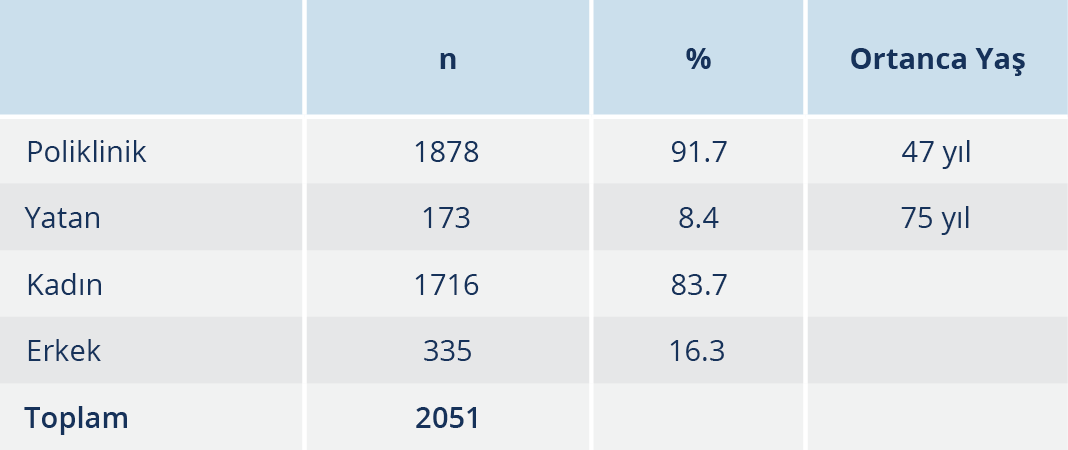 Laboratuvarımıza gönderilen 16 521 idrar örneğinin 2331 (%14.1)’inde anlamlı düzeyde bakteri üremesi, 105 (%0.6)’inde ise Candida spp. üremesi tespit edildi. Sonuçların değerlendirilmesi kapsamında aynı bakterinin tekrarlayan üremeleri çalışmaya dahil edilmemiş olup aynı hastaya ait farklı bakteri üremesi olan kültür sonuçları dahil edildi. Bu sebeple 2331 kültür pozitif örneğin 2051’i değerlendirmeye alındı. Değerlendirmeye alınan örneklerin yaş, cinsiyet, poliklinik ve yataklı servise göre dağılımları Tablo 2’de verildi. Üreme saptanan en küçük hasta 12 günlük, en büyük hasta ise 100 yaşındadır.