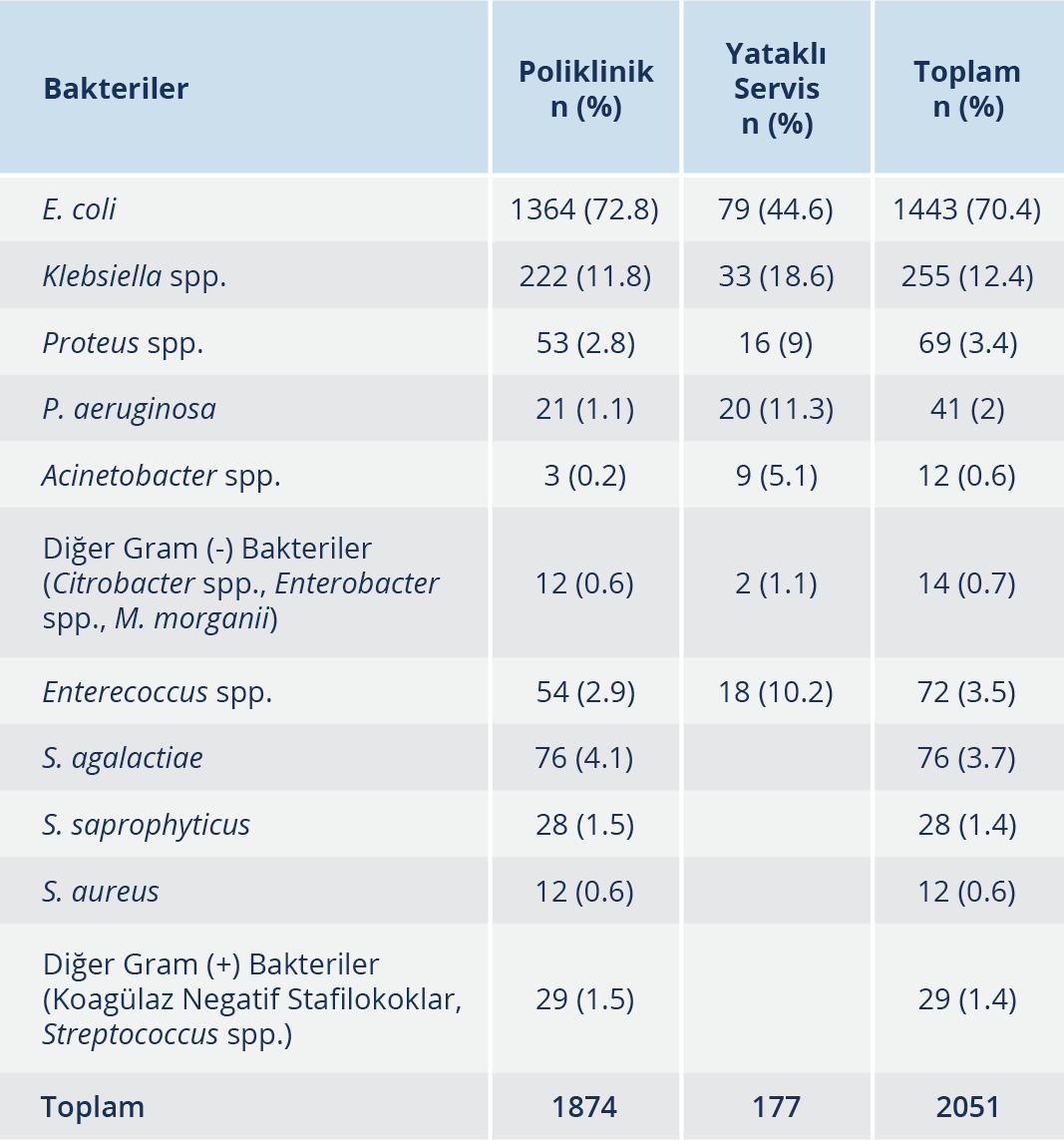 Kültürde üreme saptanan 2051 örneğin %89.4 (n=1834)’ünde Gram-negatif basil, %10.6 (n=217)’sında Gram-pozitif kok saptandı. Tespit edilen bakterilerin dağılımı Tablo 3’te verildi. Enterokok saptanan 72 örneğin 36’sı E. faecalis, 31’i Enterococcus spp. ve 5’i E. faecium olarak belirlendi. Polikliniklerden izole edilen 21 P. aeruginosa izolatından 10’unun evde sağlık biriminden geldiği, 3 hastanın ise öncesinde hastanede yatış öyküsünün bulunduğu ve yine polikliniklerden izole edilen üç Acinetobacter spp. izolatından birinin evde sağlık biriminden geldiği, birinin de öncesinde hastanede yatış öyküsünün bulunduğu görüldü.