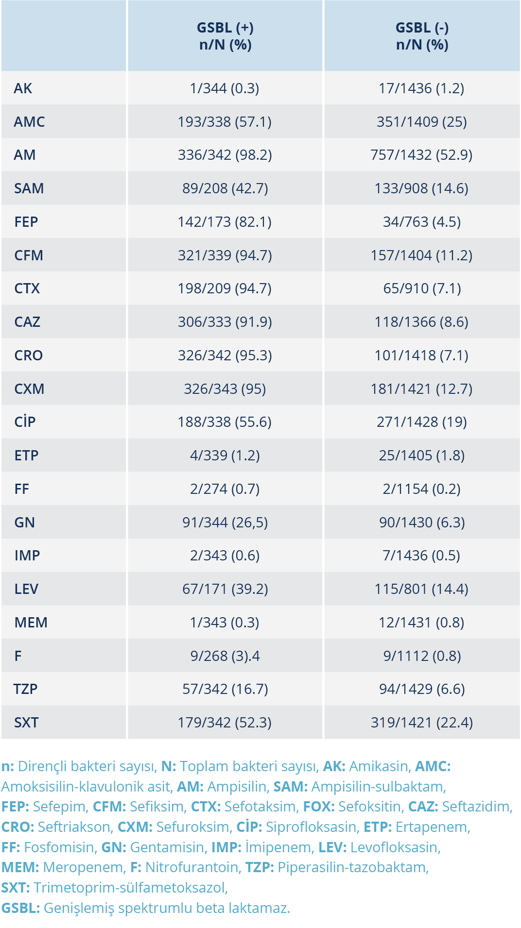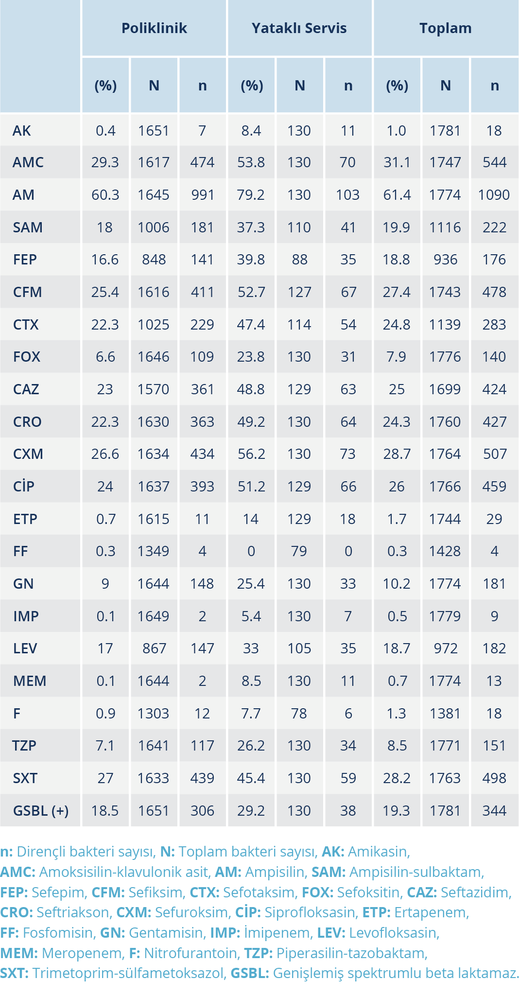 Enterobacteriaceae ailesine ait bakterilerde; poliklinik ve yataklı servislere göre antibiyotik direnç dağılımları ve toplam direnç oranlarının (Tablo 4) yanı sıra etkenlere göre antibiyotik direnç oranları (Tablo 5) belirlendi. En sık izole edilen Entrobacteriaceae üyesi bakterilerin test edilen antibiyotiklere karşı direnç oranlarının, servis ve poliklinik hastalarındaki dağılımı Tablo 6’da verildi. GSBL pozitifliğinin poliklinik ve servis hastalarındaki dağılımları Tablo 4’te, etkenlere göre GSBL pozitiflik oranları ise Tablo 5’te verildi. GSBL pozitif ve negatif saptanan örneklerdeki direnç oranları da belirlenmiş olup Tablo 7’de verildi.