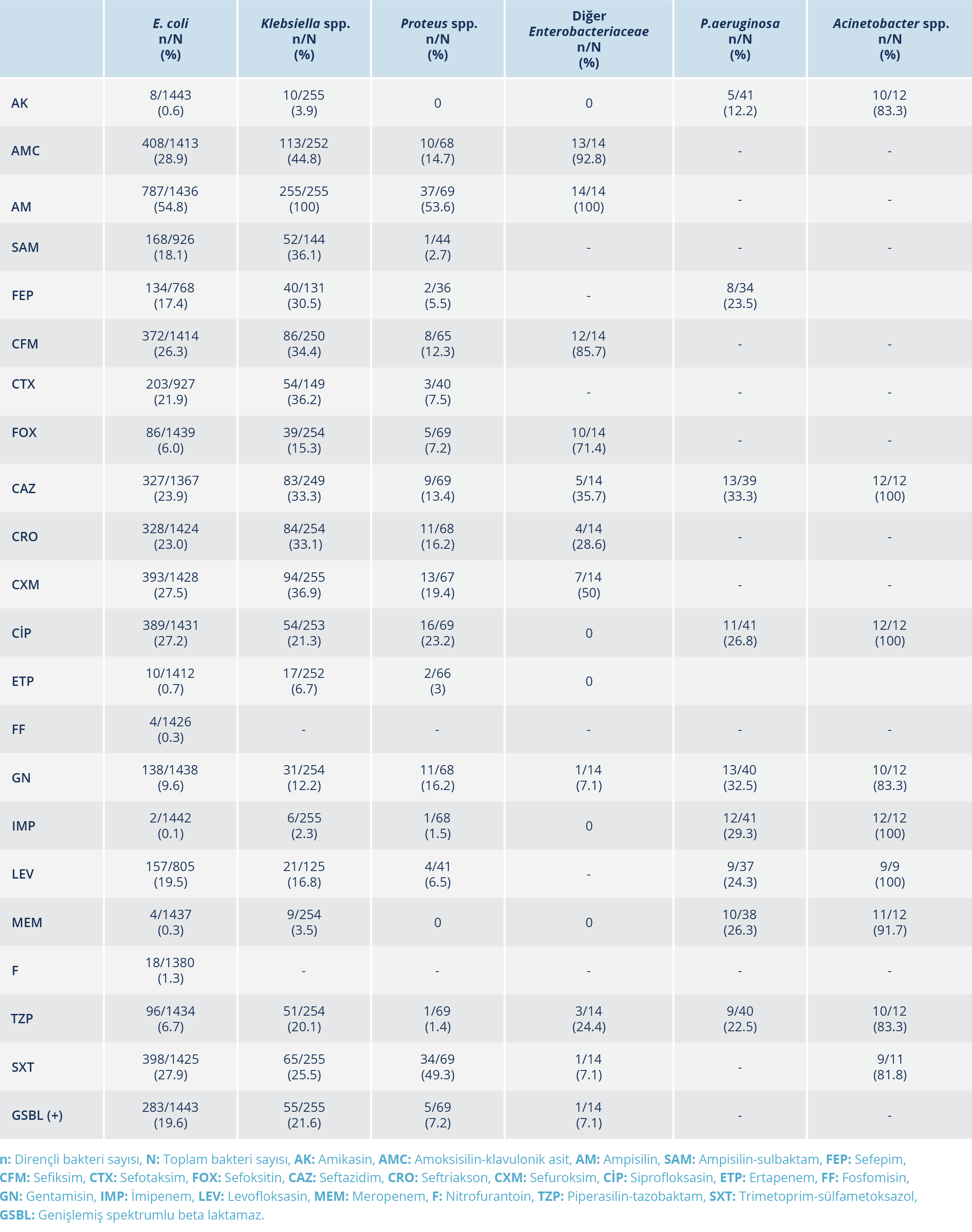 Bulgular: Laboratuvarımıza gönderilen 16 521 idrar örneğinin 2331(%14.1)’inde anlamlı düzeyde bakteri üremesi saptandı ve bunların 2051’i çalışmaya dahil edildi. En sık saptanan bakteri %70.4 oranıyla E. coli oldu. Enterobacteriaceae ailesine ait bakterilerde en fazla direnç %61.4 oranıyla ampisiline karşı görüldü. En duyarlı antibiyotikler ise sırasıyla; fosfomisin, imipenem ve meropenem olarak tespit edildi. Pseudomonas aeruginosa ve Acinetobacter spp. ise genel olarak birçok antibiyotiğe karşı yüksek oranda dirençli bulundu. İzolatlarda %19.3 oranında genişlemiş spektrumlu beta laktamaz (GSBL) pozitifliği tespit edildi. GSBL pozitif örneklerde en yüksek direnç %98.2’le ampisiline karşı gözlendi. Enterokok türlerinde izolatların tamamı linezolide; S. saprophyticus izolatlarının tamamı siprofloksasin, linezolid, vankomisin, teikoplanin ve trimetoprim sülfametoksazole; S. agalactiae izolatlarının tamamı penisilin, vankomisin, teikoplanin ve linezolide karşı duyarlı bulundu.